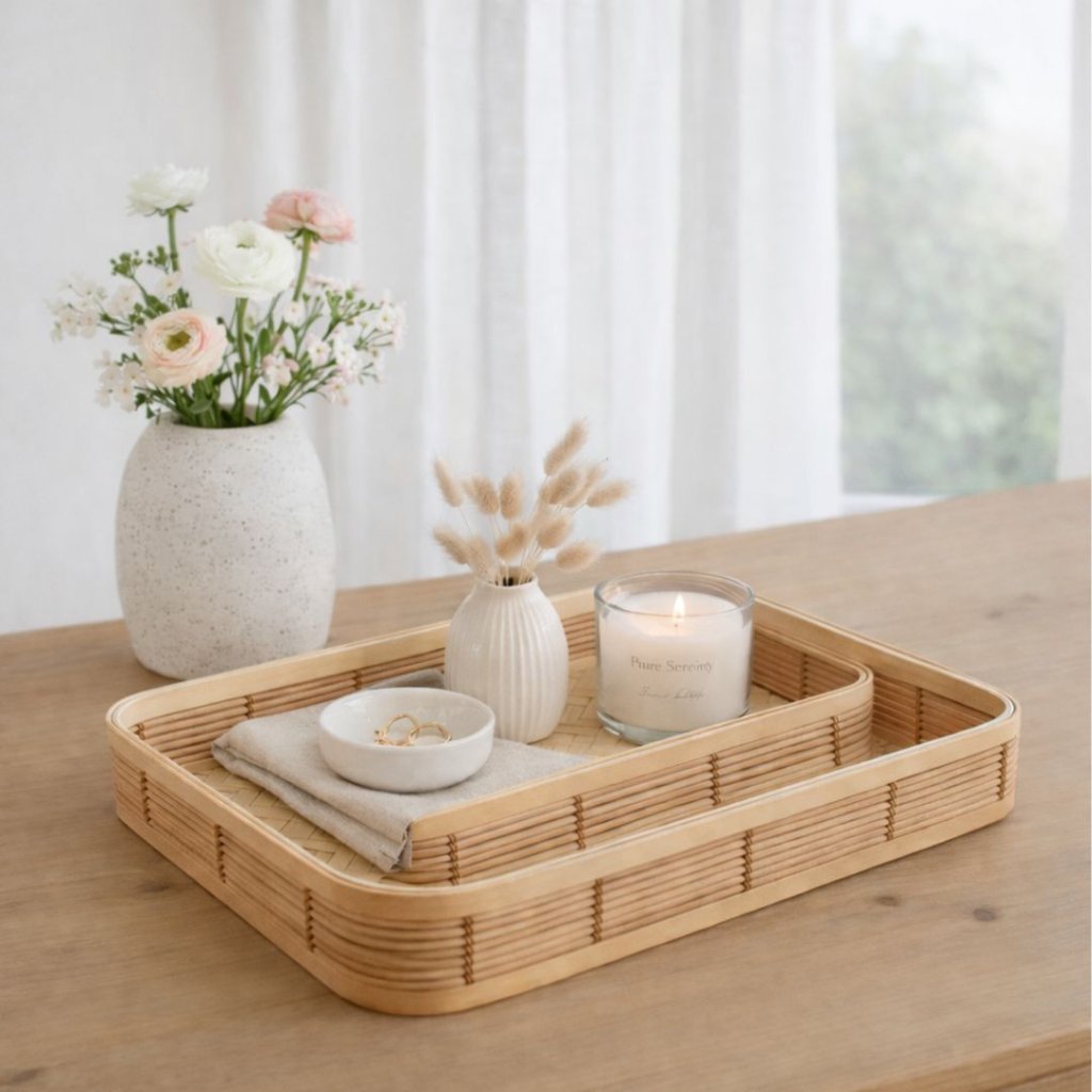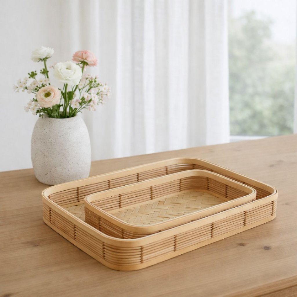 - Bambusový podnos v sadě 2 kusů. Podnosy jsou vyrobeny z bambusového dřeva a propleteny do krásného vzhledu, díky čemuž se dokonale hodí do Vaší kuchyně jako servírovací podnosy, dekorace nebo i úložné prostory pro různé drobnosti. Ať už zvolíte jakékoliv využití, tak budete mít doma krásný přírodní prvek, který můžete podle potřeby umísťovat v celém Vašem krásném domově.