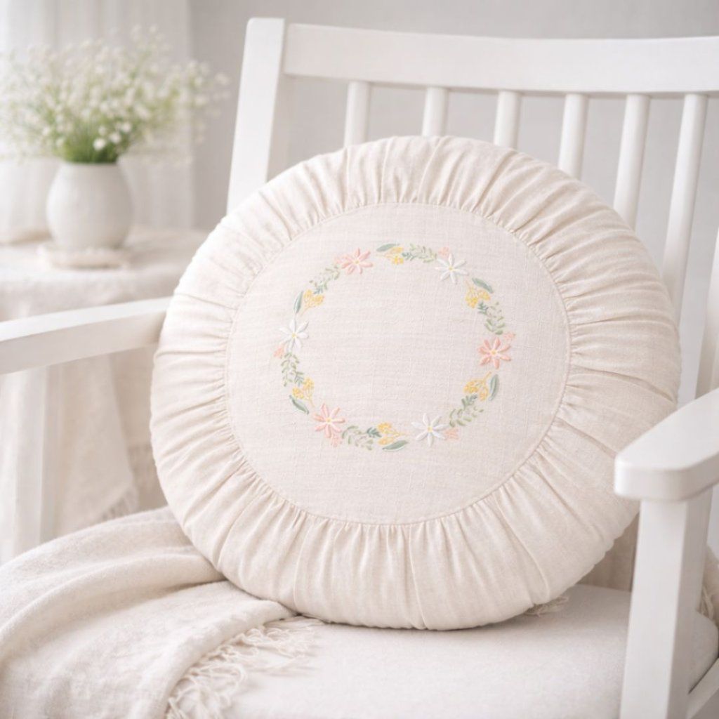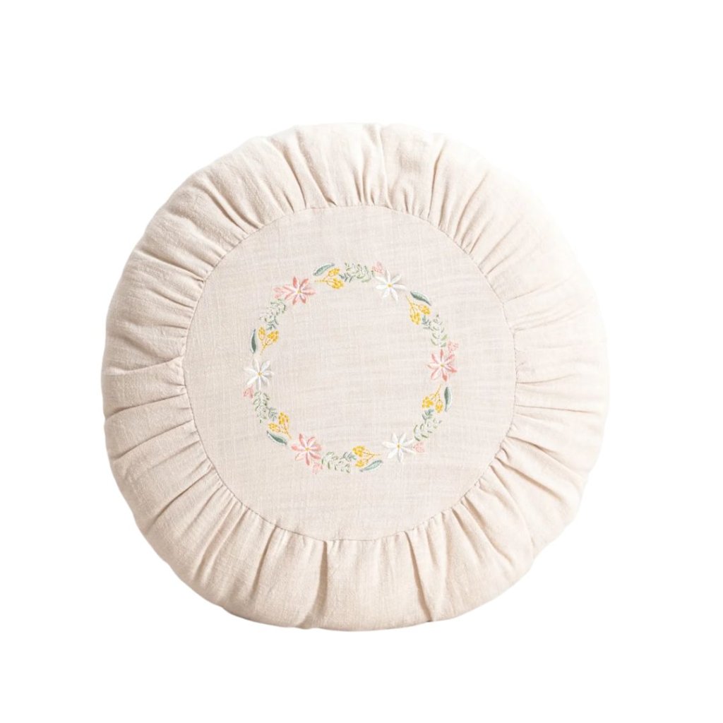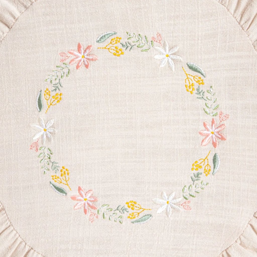 - Ecru odstín v kombinaci s decentní výšivkou v podobě květinového věnce působí přirozeně a lehce romanticky. Pastelové, přesto svěží tóny dodávají polštářku jemný akcent, aniž by narušily harmonii interiéru.