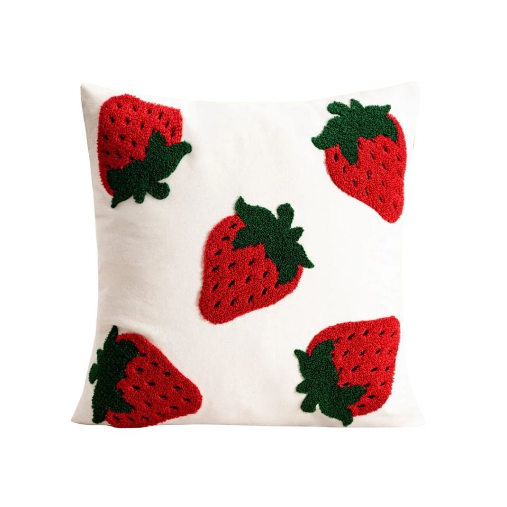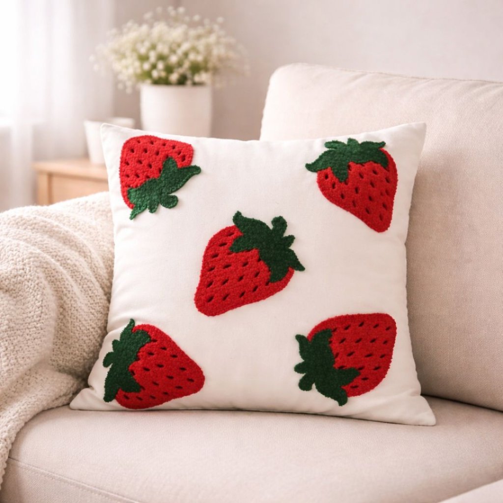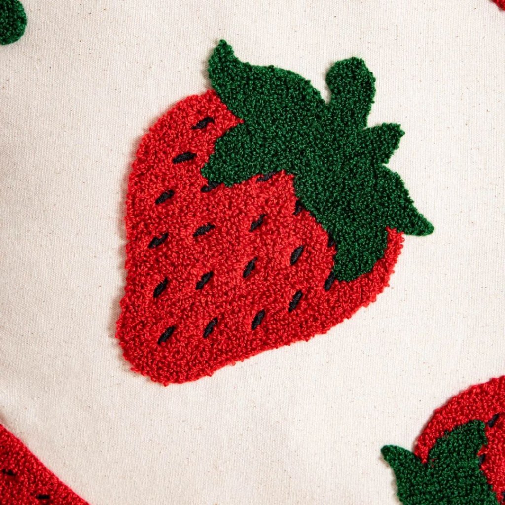 - Lněný povlak s vyšívanými jahodami, které jemně vystoupí z povrchu.
