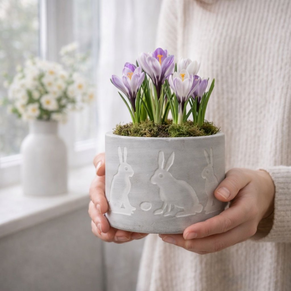 - Oživte své interiéry i exteriéry tímto jedinečným betonovým obalem na květiny s jarním, velikonočním motivem.
