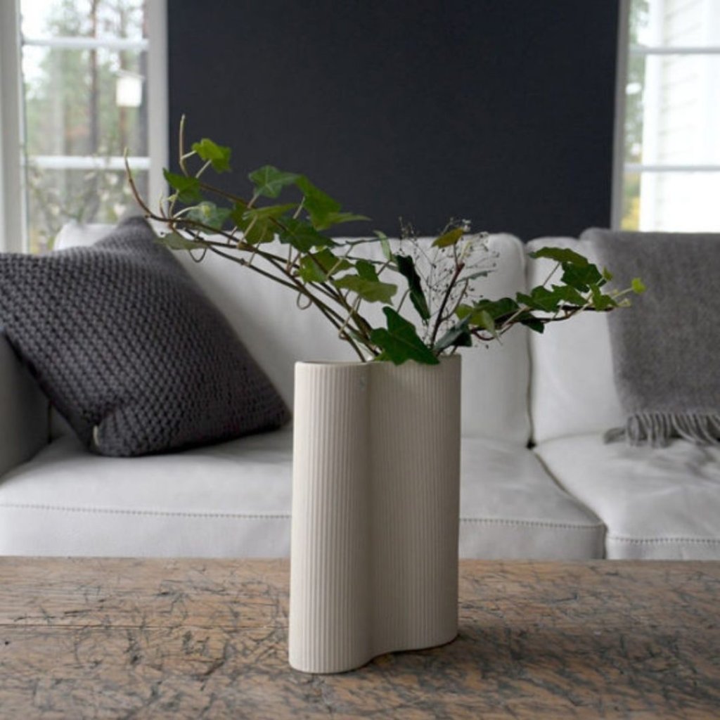 Váza z matné keramiky. Vlnitý tvar vázy vytváří klid, který se rozlévá po celé místnosti. Sama o sobě stojí moc hezky, ale pokud chcete kombinovat, má stejně decentní liniový vzor jako mnoho dalších našich produktů. Ideální pro sušená stébla v zimě a tulipány na jaře.