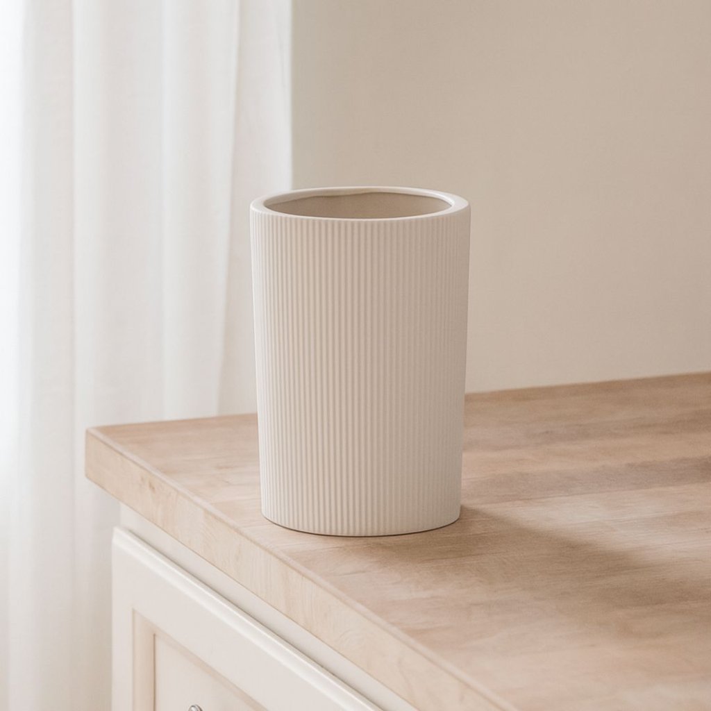 Vysoká keramická váza s jemnými vertikálními rýhami na povrchu. Jednoduchá krása designu z něj dělá úžasný doplněk do každé domácnosti. Použijte jej na letní kytici, pár elegantních suchých rákosin nebo větev smrku v zimě.