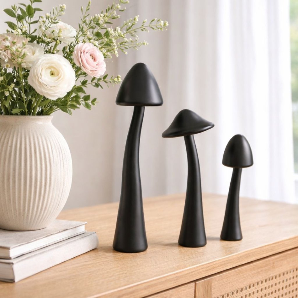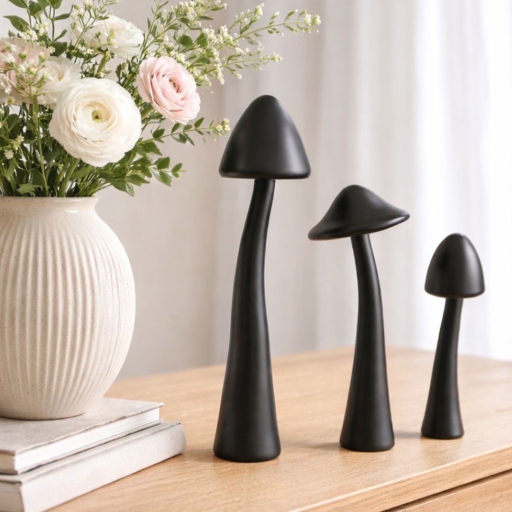 Matně černé porcelánové houby působí jako drobný sochařský detail, který prostor zklidní a zjemní.