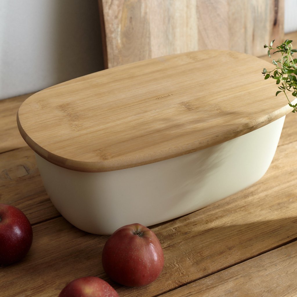 - Kombinace béžové a přírodního dřeva osloví nejen milovníky Scandi. Chlebník NORES má jednoduchý, mírně zaoblený tvar a jeho tvar se směrem nahoru rozšiřuje, aby se z něj dal bochník snadno vytáhnout. Bambusové víko lze použít i jako prkénko.