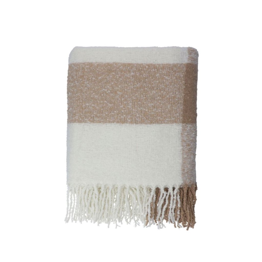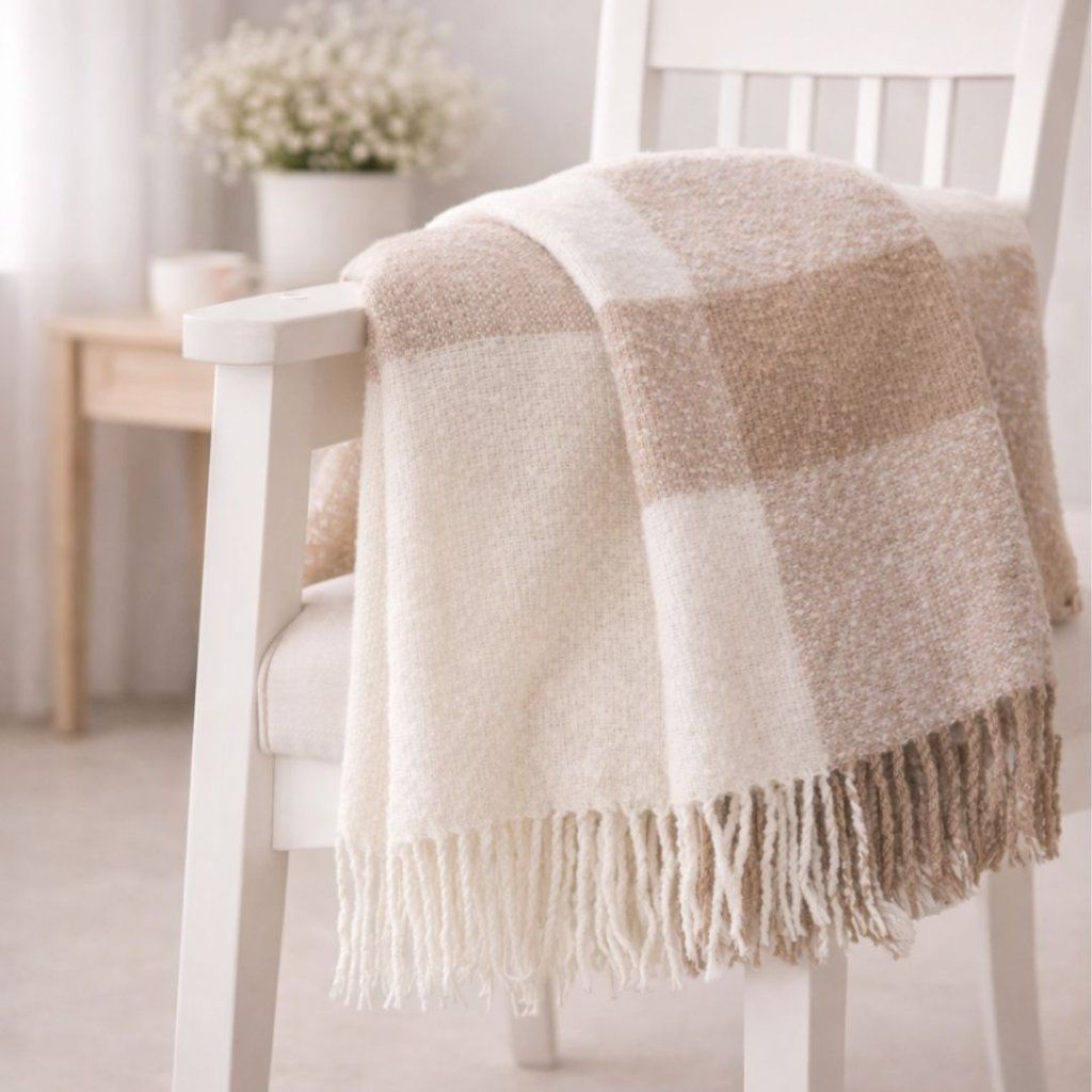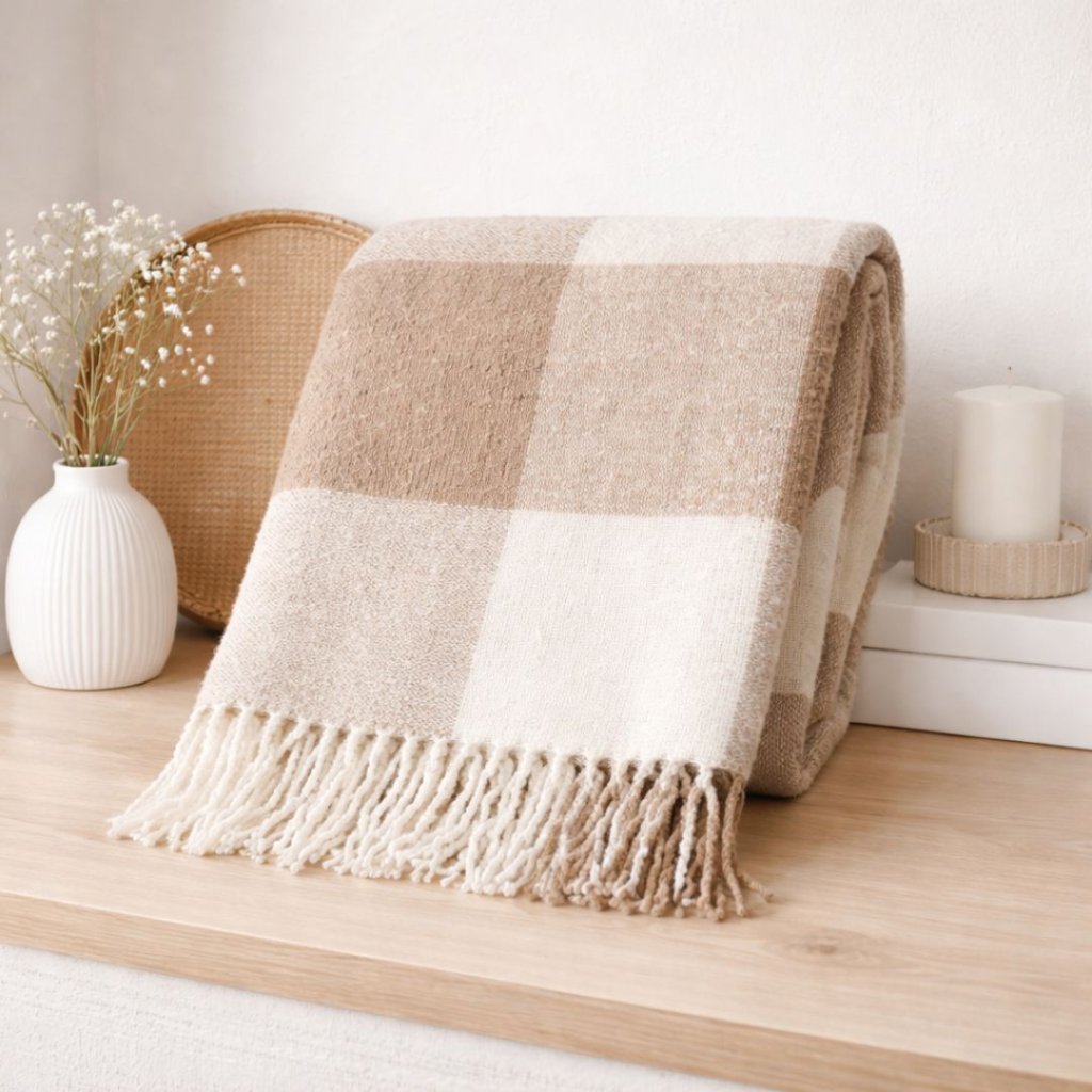 - Elegantní béžová deka s jemným kostkovaným vzorem je ideálním doplňkem do moderního i přírodně laděného interiéru.