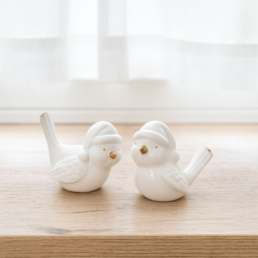 - Roztomilí keramickí ptáčci v lesklé bílé glazuře s jemnými zlatými akcenty na zobáčku, ocásku a čepičce jsou ideální dekorací pro zimní a vánoční období.