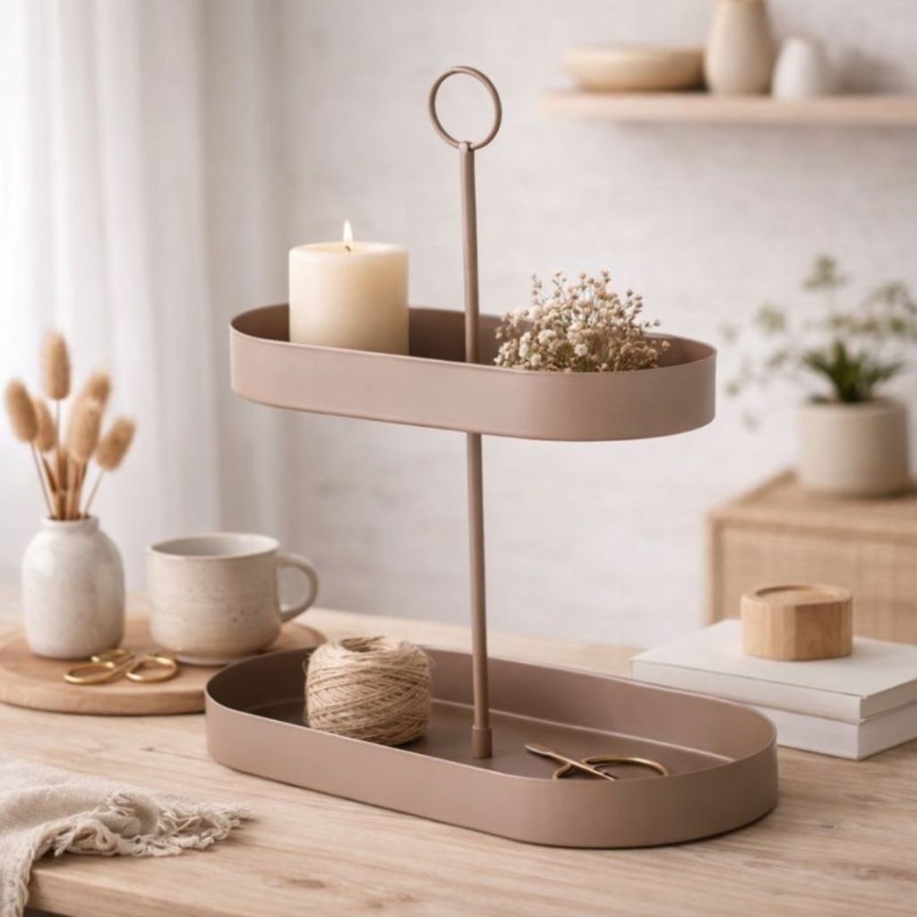 - Tento kovový dekorační podnos s dvěma úrovněmi je ukázkou promyšleného designu, který spojuje estetiku a funkčnost v dokonale vyváženém celku.