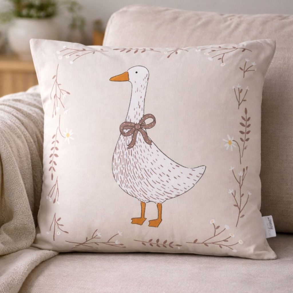 - Dekorační polštář s ilustrací husy a jemným květinovým rámem je nádherným doplňkem do interiéru ve venkovském, skandinávském i přírodním stylu.