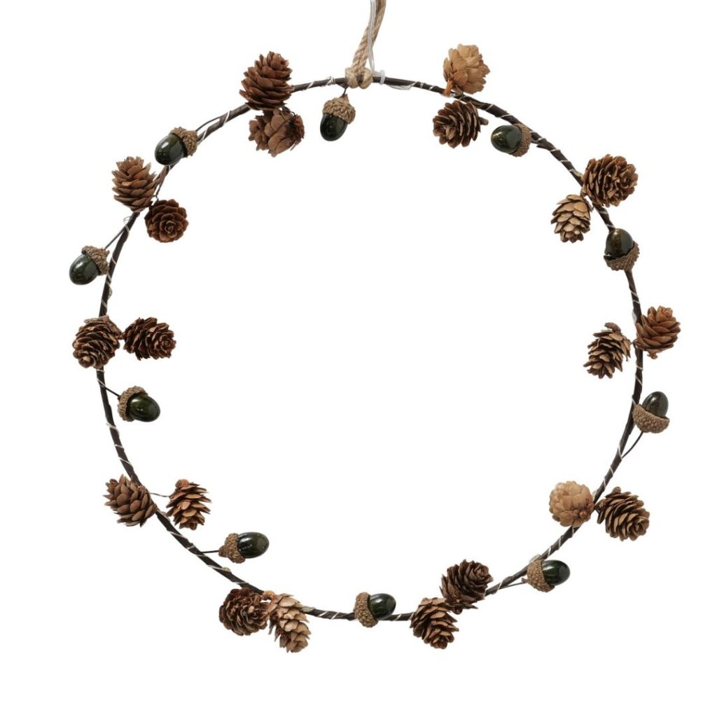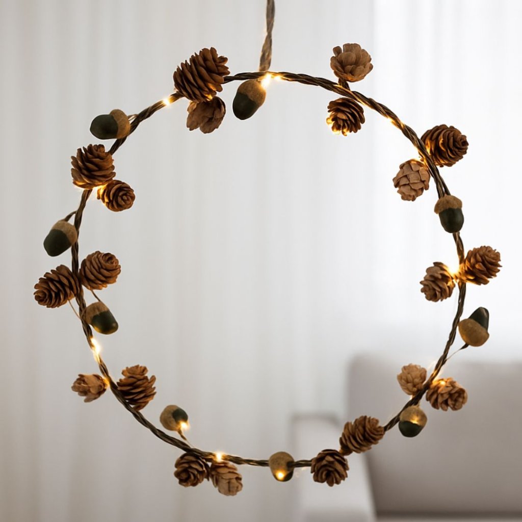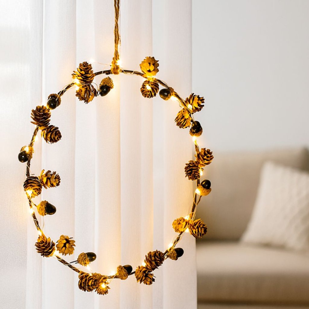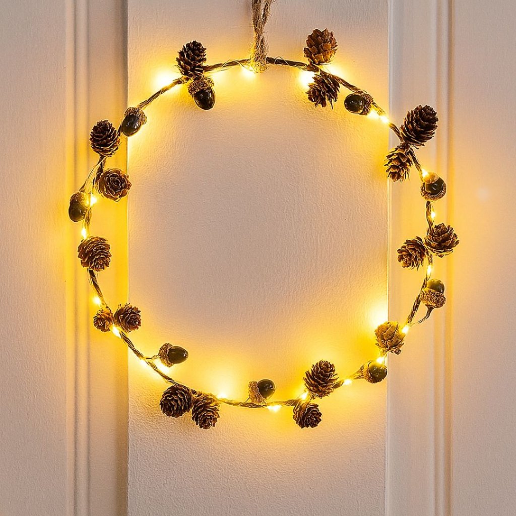 - Dekorační věnec s LED osvětlením, stylový věnec s přírodními prvky jako jsou umělé šišky a žaludy, doplněný jemným LED osvětlením.