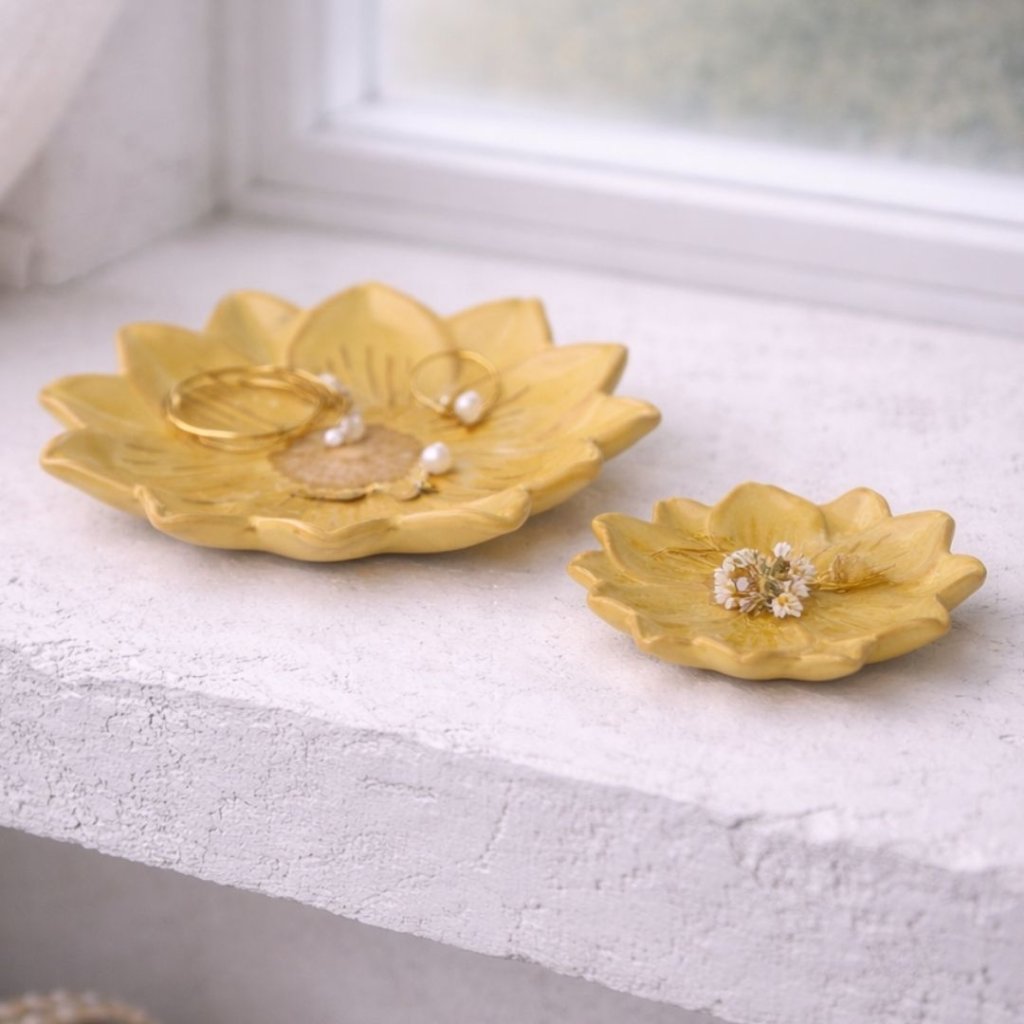 - Dvě malé misky, které vypadají, jako by si je někdo utrhl rovnou ze slunné louky. Květinový tvar a jemná žlutá melanž vnáší do prostoru světlo, lehkost a klid. Nejsou nápadné, a přesto si jich všimnete pokaždé, když kolem projdete.