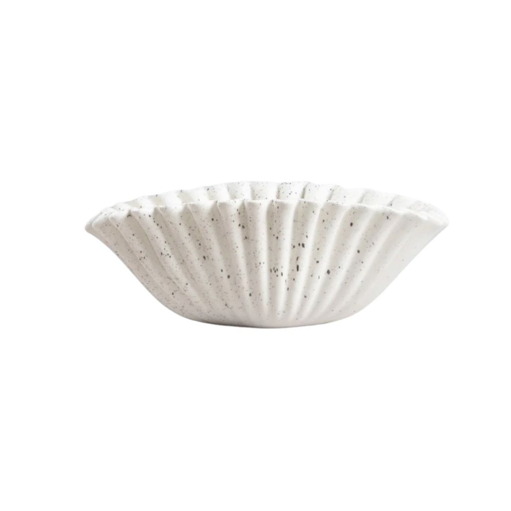 Jemně vroubkovaný tvar a lehké tečkování dodávají misce přirozený, vzdušný charakter. Působí nenápadně, ale přesto zaujme – jako detail, který dotváří celý prostor.