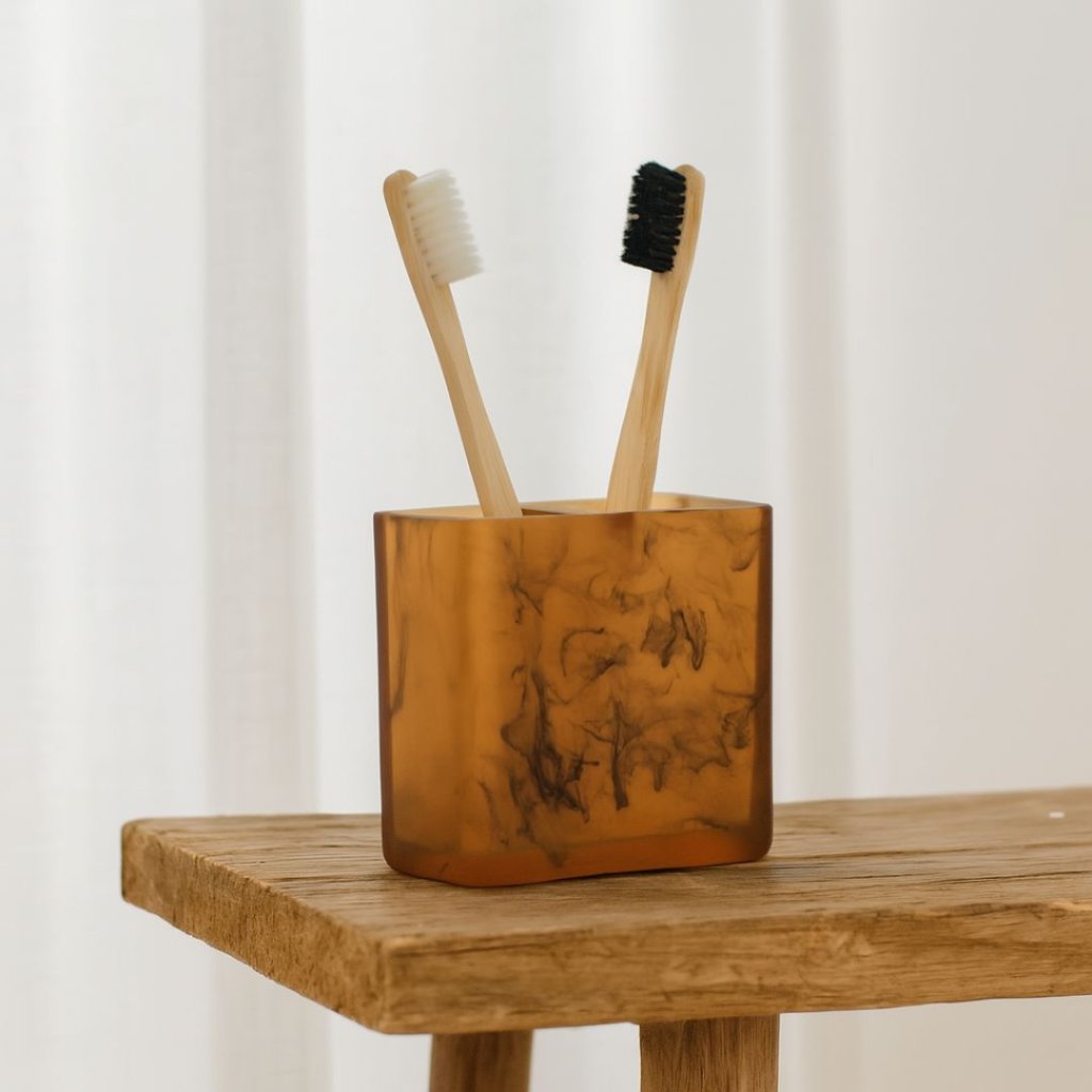 - Elegantní hrnek na zubní kartáčky o rozměrech 11,5 × 6 cm s praktickými dvěma oddělenými přihrádkami. Jeho hnědý odstín v kombinaci s nepravidelnými žíhanci a oděrkami vytváří vzhled, který připomíná strukturu přírodního jantaru. Skvěle zapadne do minimalistických i rustikálně laděných koupelen.