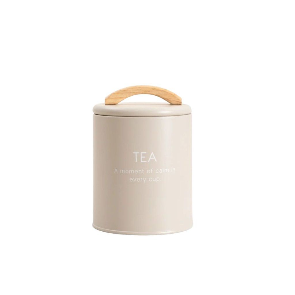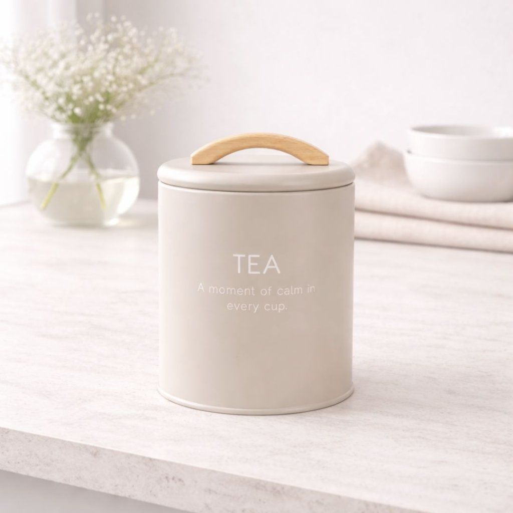 Béžová nádoba s dřevěným detailem působí jemně a přirozeně v každé kuchyni.