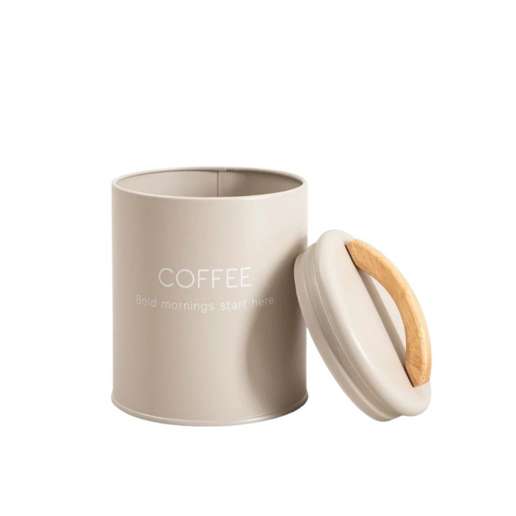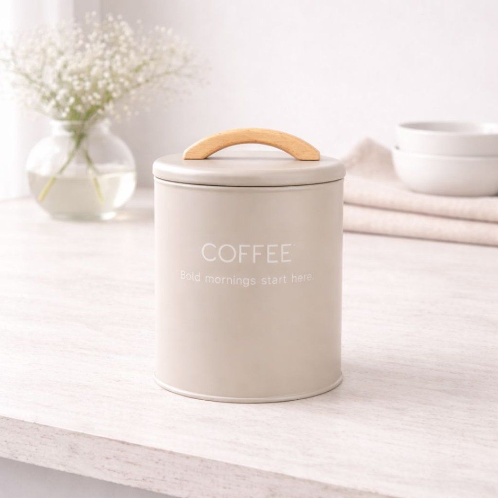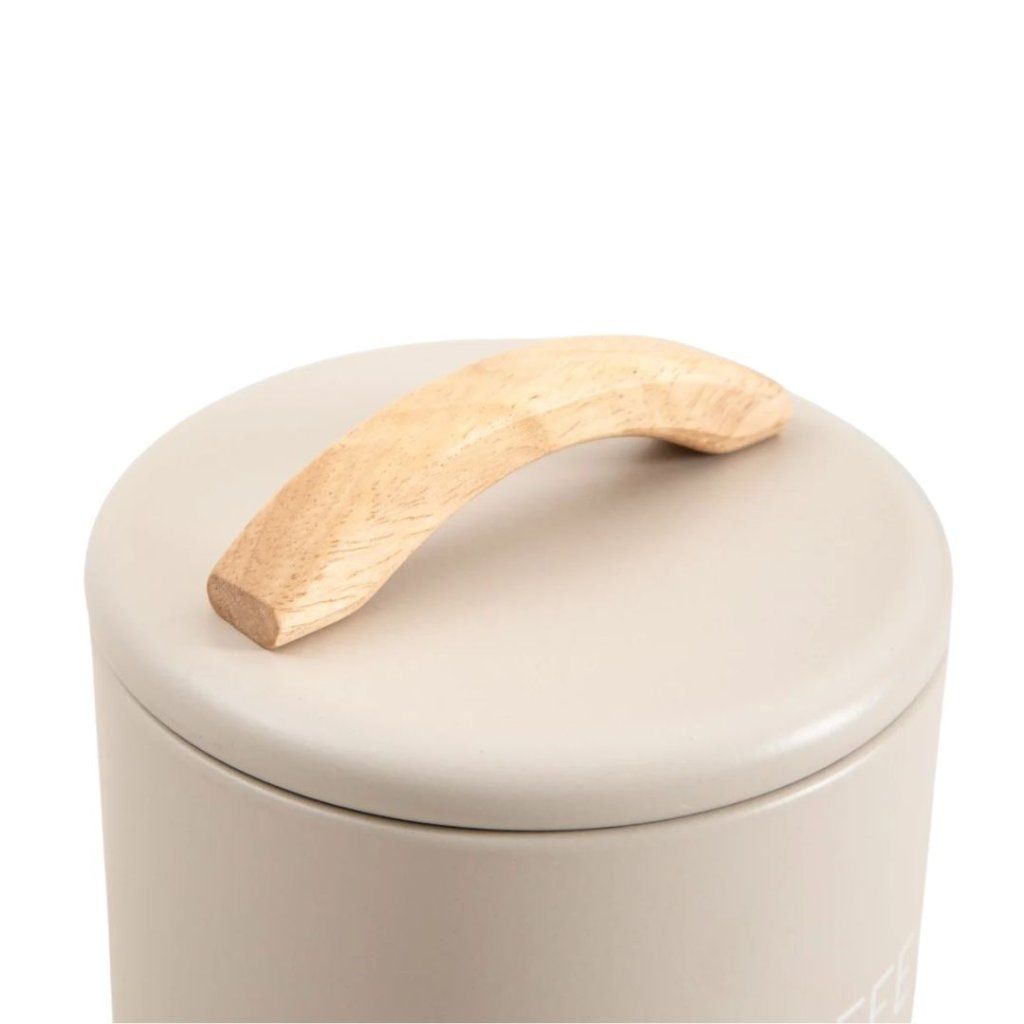Béžová dóza s dřevěným detailem přirozeně zapadne do každé kuchyně.