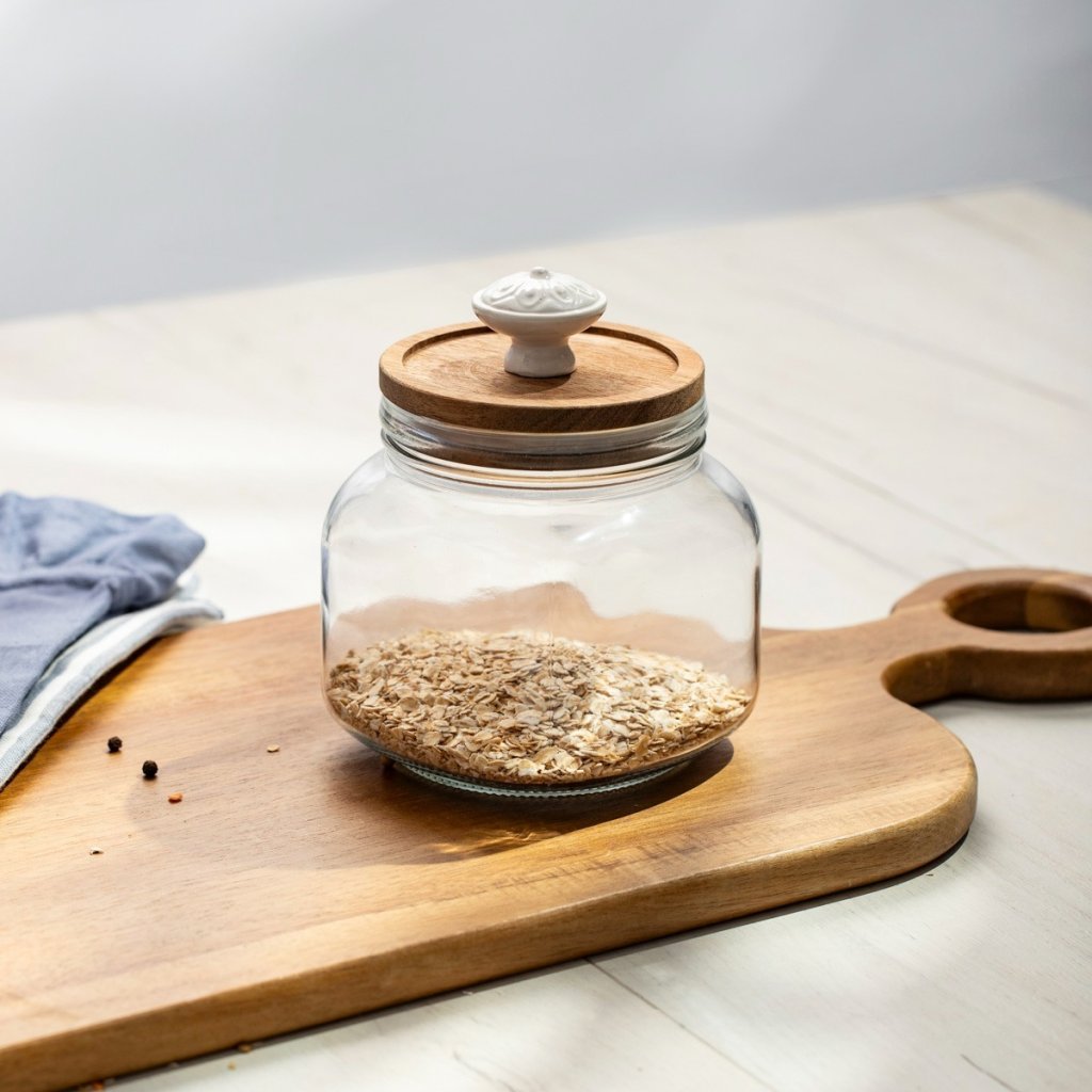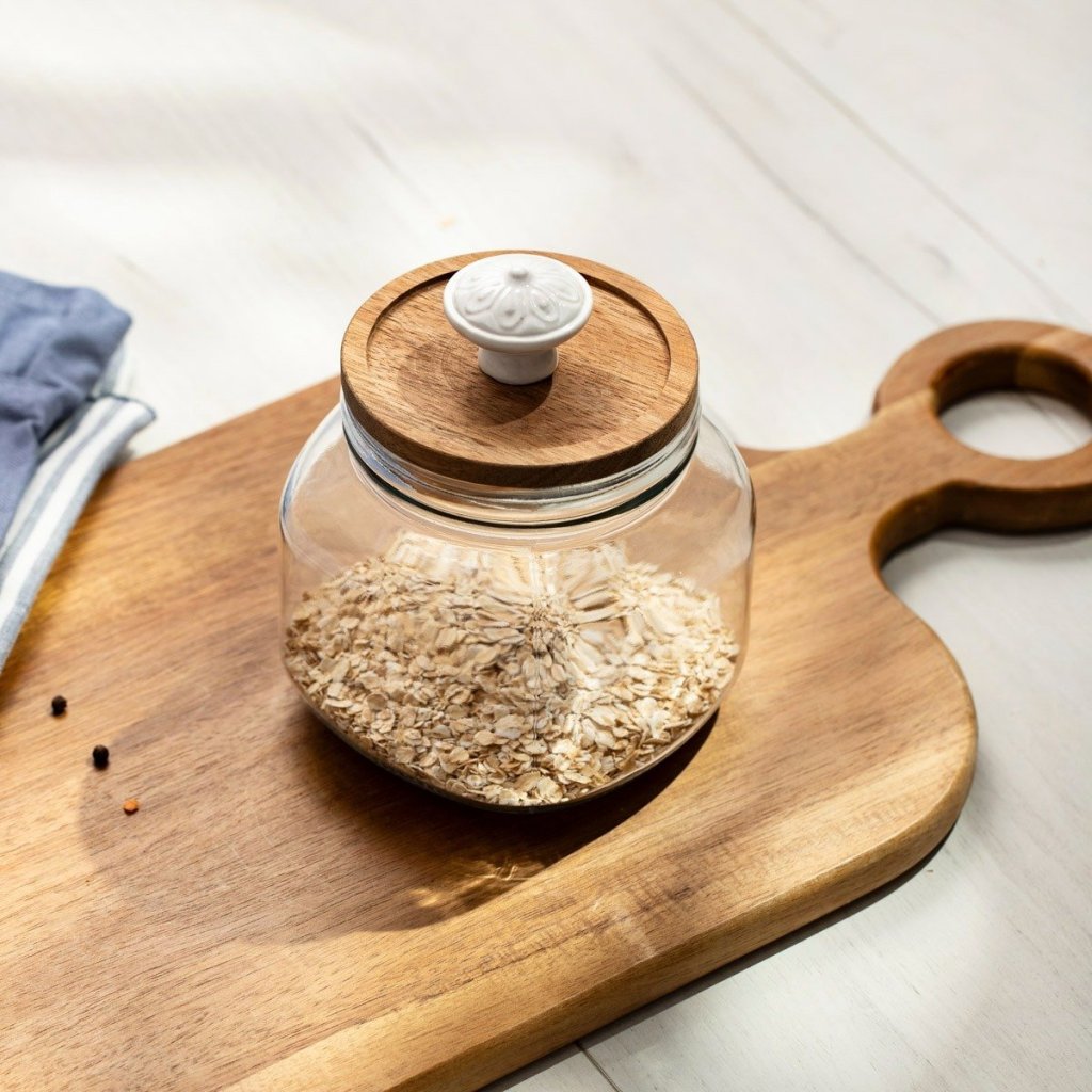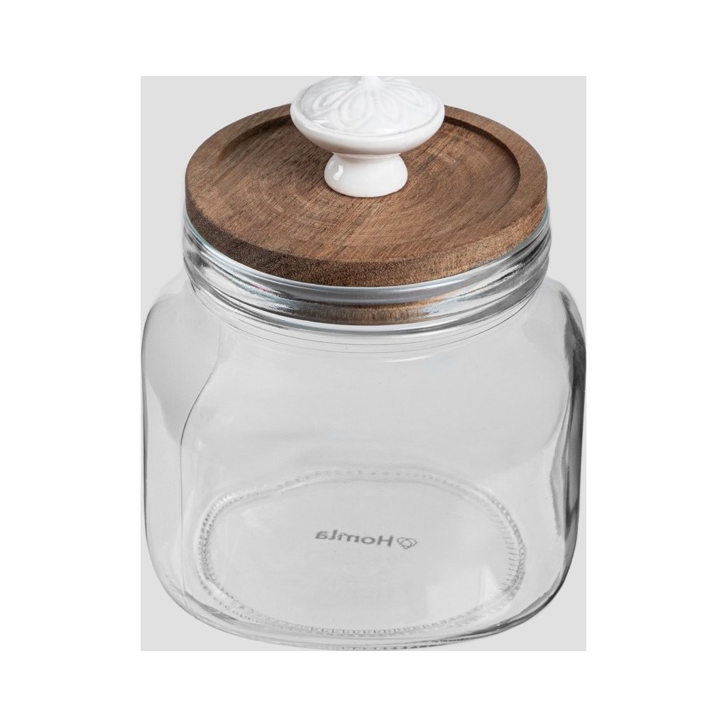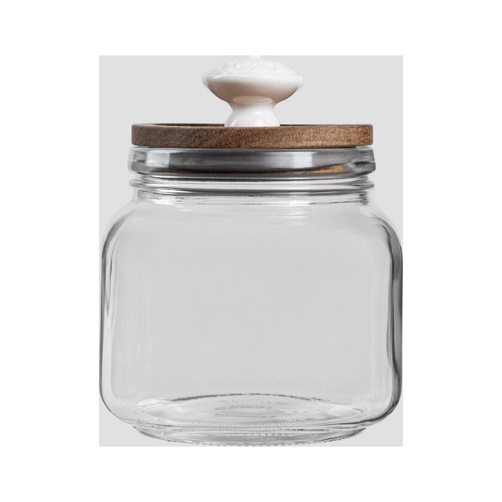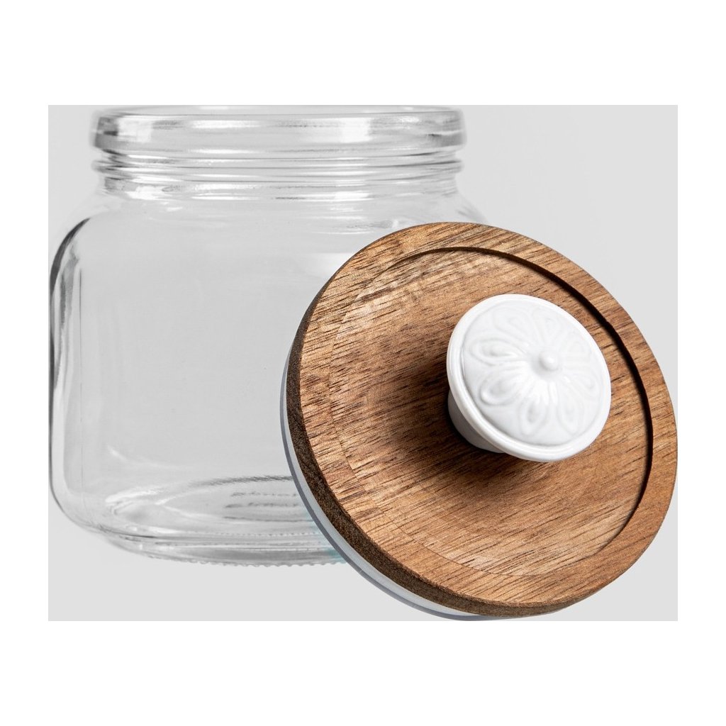 - Elegantní dóza z čirého skla s víkem z akáciového dřeva ozdobeným keramickým úchytem je dokonalým doplňkem pro stylové a přehledné skladování. Ideální na čaj, koření, oříšky nebo drobné kuchyňské ingredience.