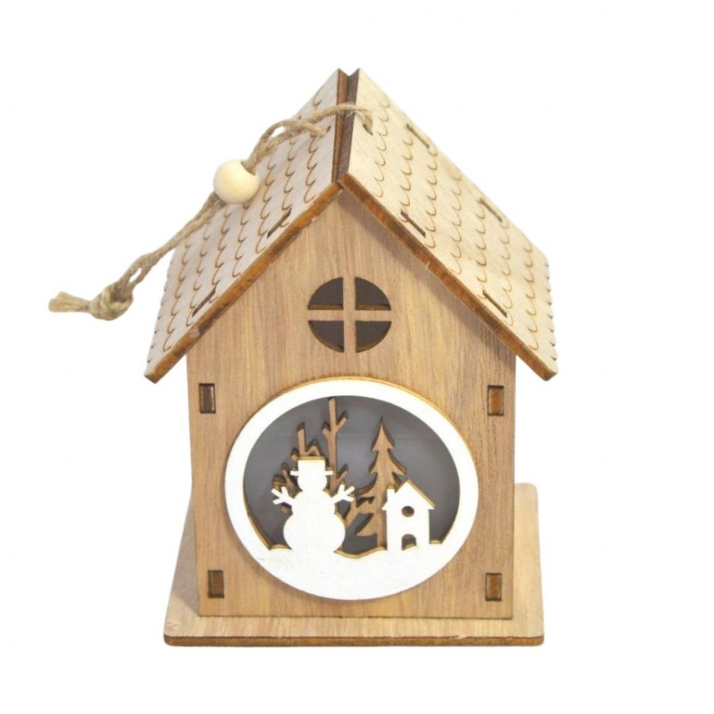Dřevěný závěsný domek s LED osvětlením s krásným motivem sněhuláka bude zdobit váš krásný domov. Vhodný i k zavěšení na vánoční stromek, je lehký takže větve stromku nezatíží.