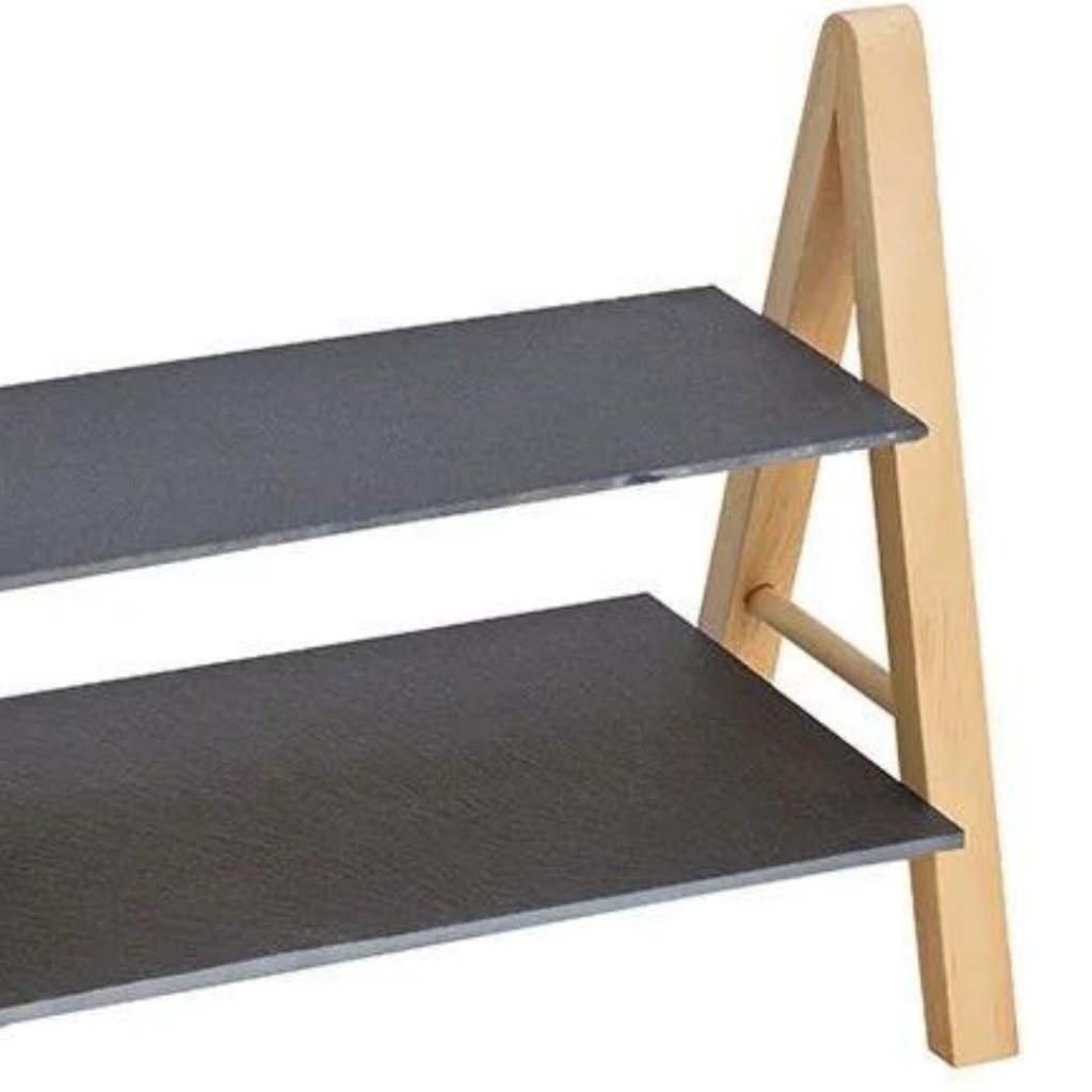 Dřevěný etažér s břidlicí v černé barvě o délce 32 cm bude zdobit vaší kuchyň, jídelnu nebo i obývycí pokoj. Krásný doplněk na hrnečky, talíře a jiné potřeby v domácnosti.