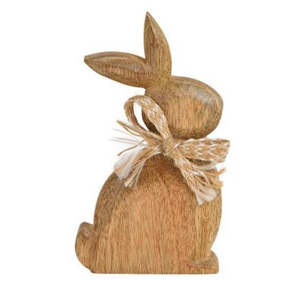 Dřevěná dekorace z mangového dřeva ve tvaru králíka s mašličkou je krásným sezóním doplňkem na poličku nebo komodu o velikonočních svátcích.