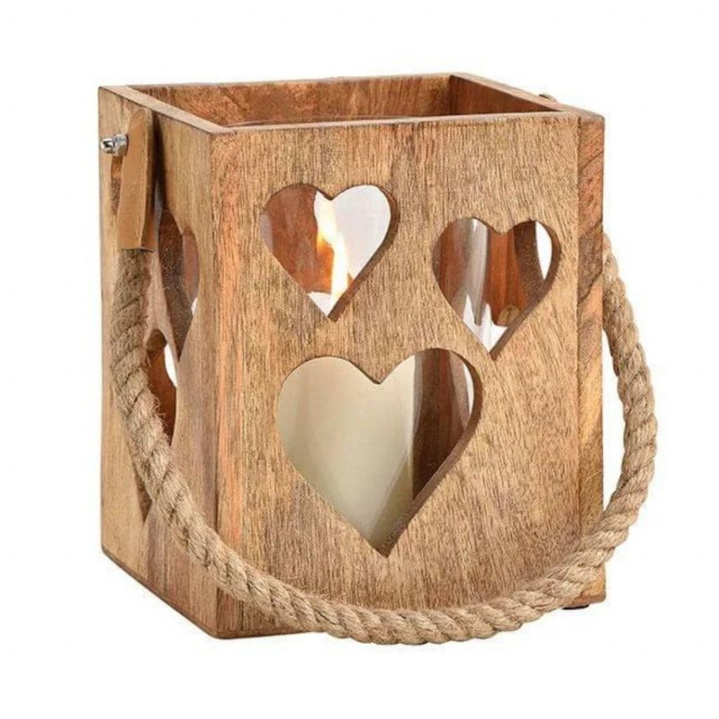 Krásný dřevěný svícen z nádherně strukturovaného mangového dřeva s výřezem srdce a skleněnou nádobou na svíčku je dokonalým doplňkem do vašeho útulného domova kde při setmění vykouzlí parádní atmosféru a vy budete mít radost a úsměv na tváři vždy při pohledu na tento krásný svícen. Lano poslouží k přenosu nebo k zavěšení lucerny.