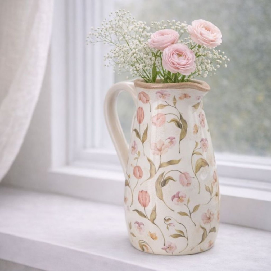 Džbán Rosita stojí tiše na parapetu a přirozeně se stává součástí dne – jako by tam patřil odjakživa. - Jeho jemný květinový motiv působí klidně a lehce nostalgicky. Připomíná pomalá rána, kdy není kam spěchat, a obyčejné chvíle, které mají zvláštní kouzlo. Krásně poslouží jako váza na čerstvé nebo luční květiny, ale i sám o sobě vnese do prostoru pocit domova a tepla.