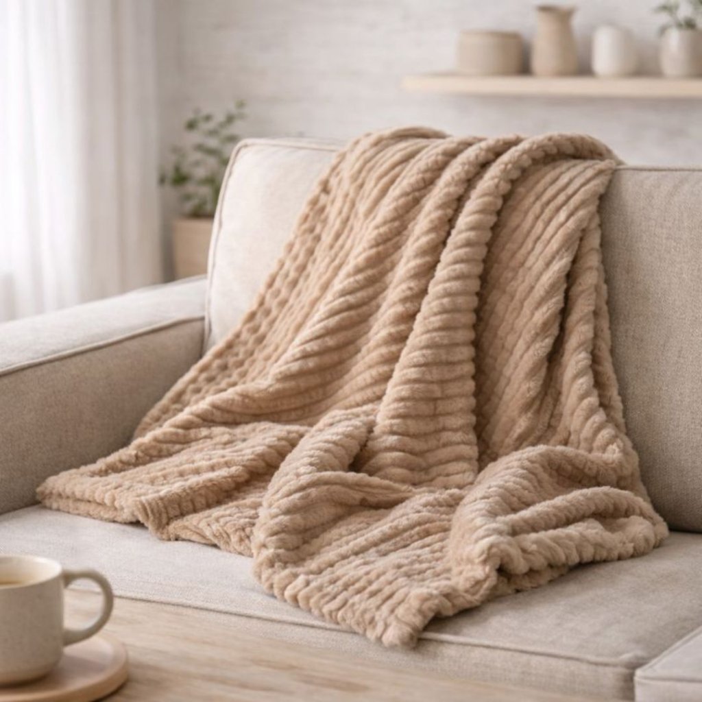 - Jemná žebrovaná struktura dodává dece hloubku a vizuální zajímavost, zatímco měkký materiál příjemný na dotek vybízí k odpočinku a chvílím klidu.