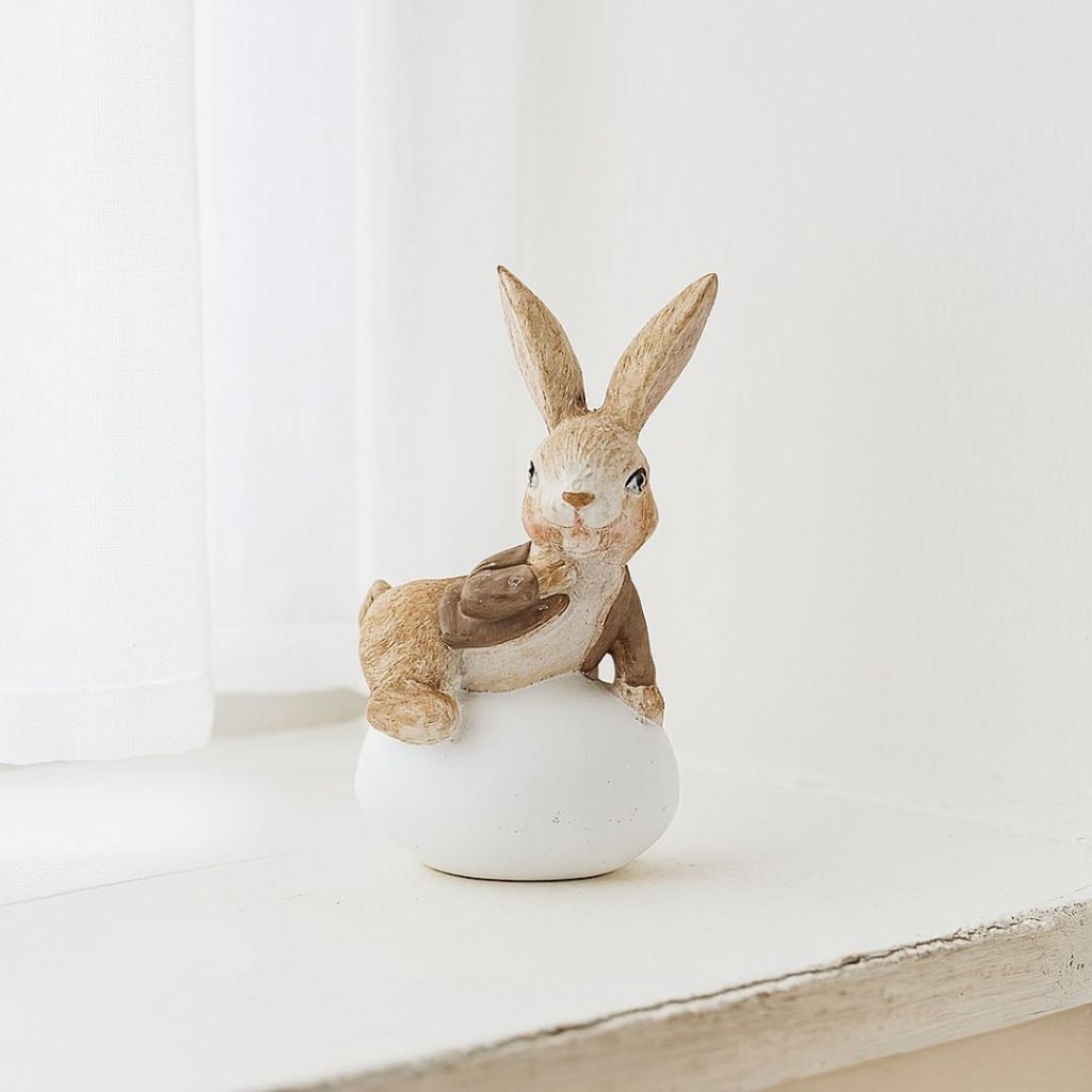 - Hravý velikonoční zajíček s vajíčkem z polyresinu slouží jako krásná velikonoční dekorace.