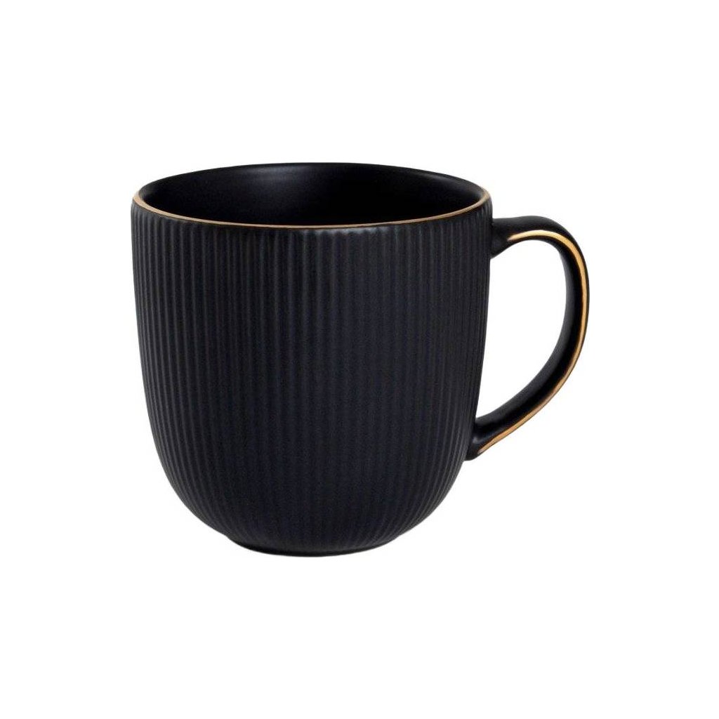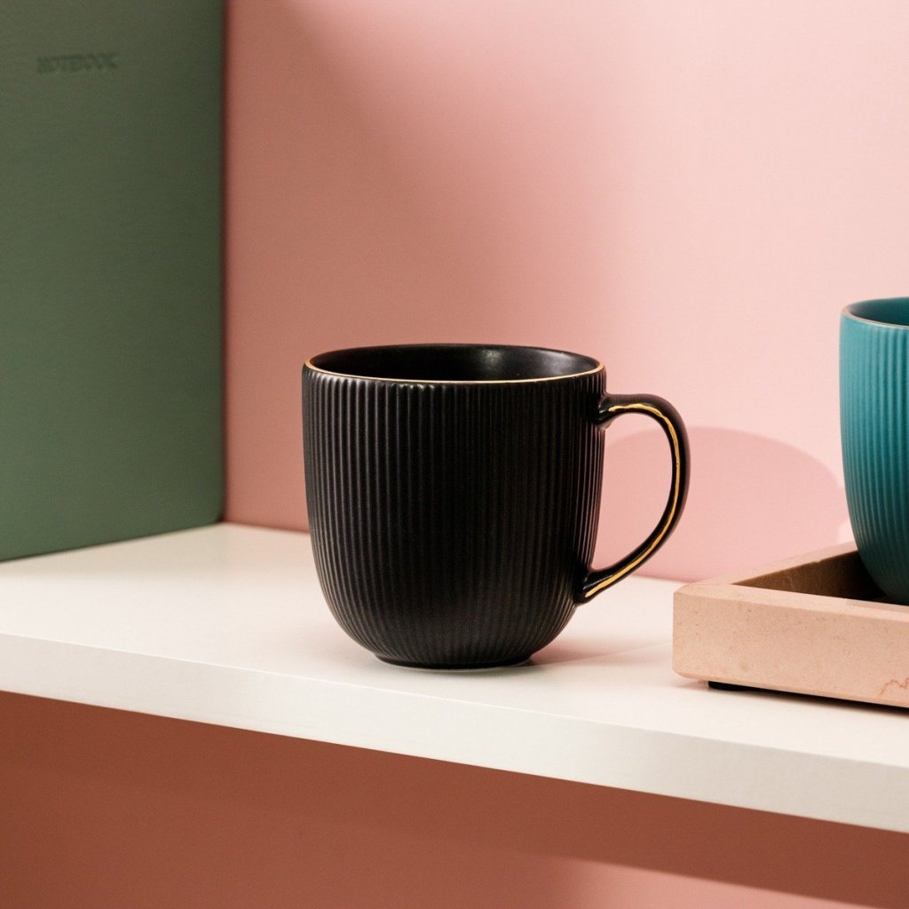 - Hrnek je v pastelové barvě. Má jemnou zlatou výzdobu na okrajích a dekorativní, vroubkovaný povrch. Porcelánový hrnek bude perfektní nádobou na horký nápoj, který dodá kouzlo každému stolu.
