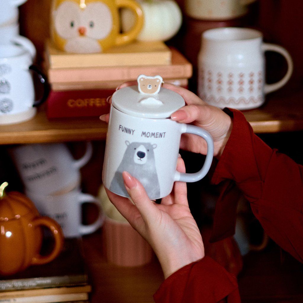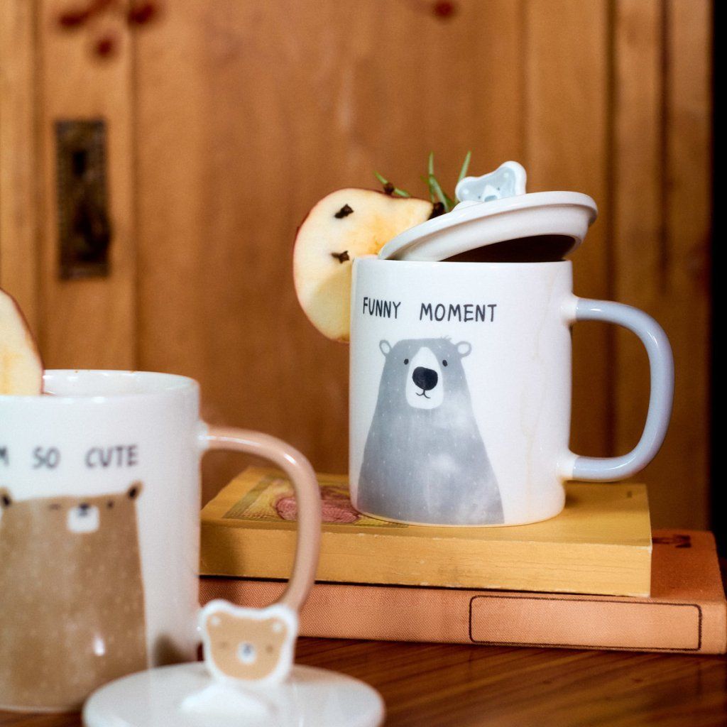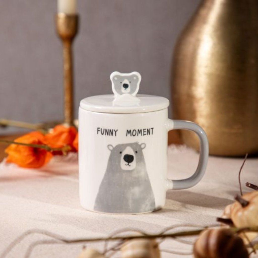 - Okouzlující šedý vzor medvídka s praktickým víčkem je perfektní volbou pro ranní kávu nebo večerní čaj.