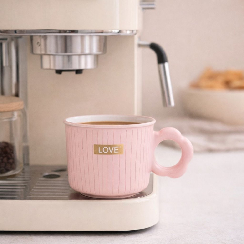 Porcelánový hrnek s nápisem LOVE je malým každodenním připomenutím, že na chvíle pro sebe se nemá zapomínat. Elegantní vertikální struktura, zlatý detail a originální kulaté ucho z něj dělají kousek, který vynikne i v minimalistickém interiéru.