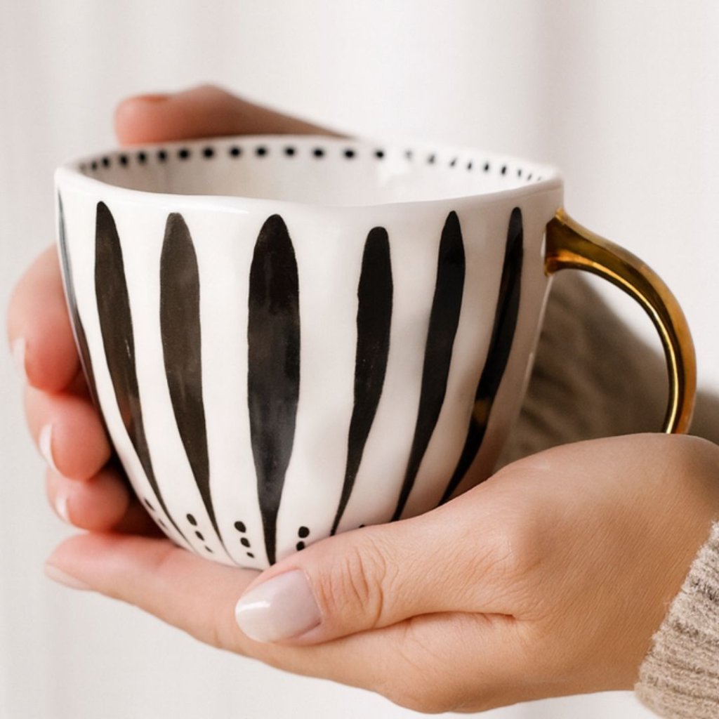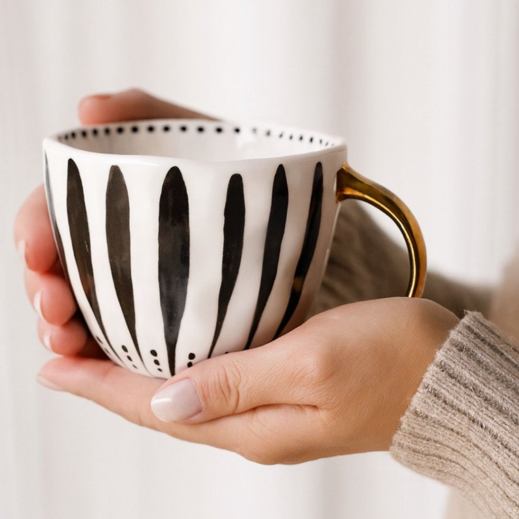 - Stylový, originální a přesně tak velký, aby pojal pořádnou dávku ranní kávy nebo čaje. Ručně malovaný design v kombinaci s elegantním ouškem ze zlata z něj dělá kousek, který si prostě zamilujete.