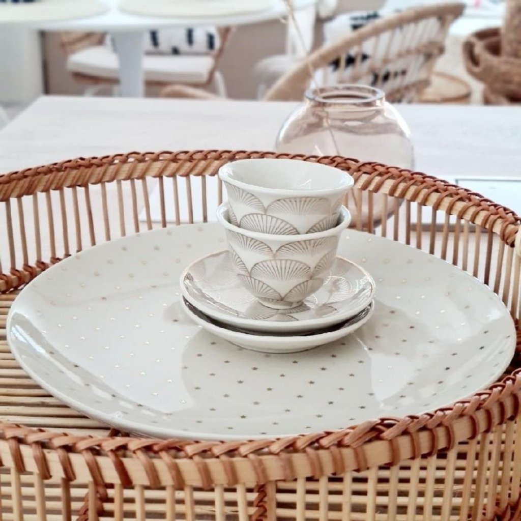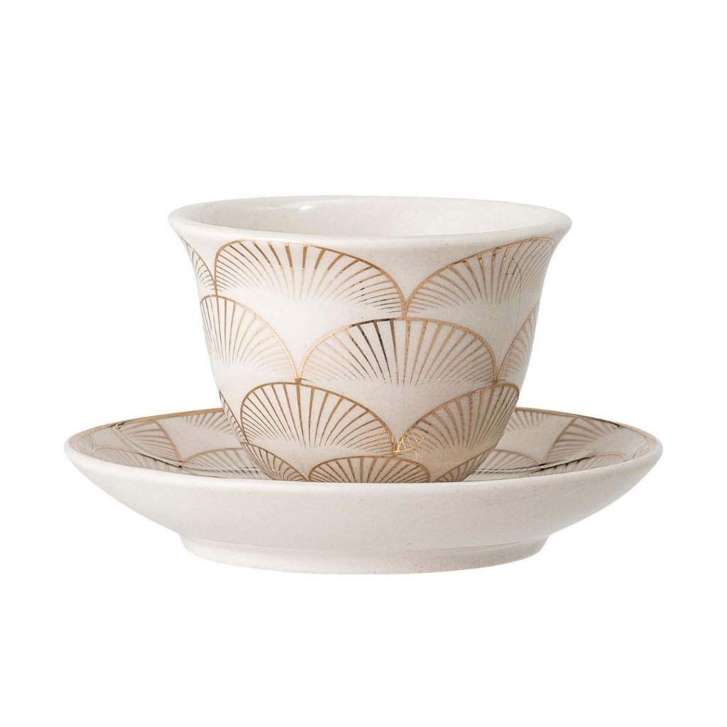 Značka Bloomingville Vás okouzlí nejen vázami, přírodním materiálem jako je teakové a akátové dřevo, ale i další dokonalou keramikou, ale i kvalitním porcelánem a kuchyňskými doplňky. Příkladem je tento bílý kameninový hrnek s podšálkem z kolekce Aruba který bude ve Vaší kuchyni a při stolování doslova zářit.Metalický dekor se zlatým stylem bude vynikat . Jedinečnost, originalita a krásný design vše jen podtrhují a díky dokonalému zpracování Vám bude sloužit mnoho a mnoho let.