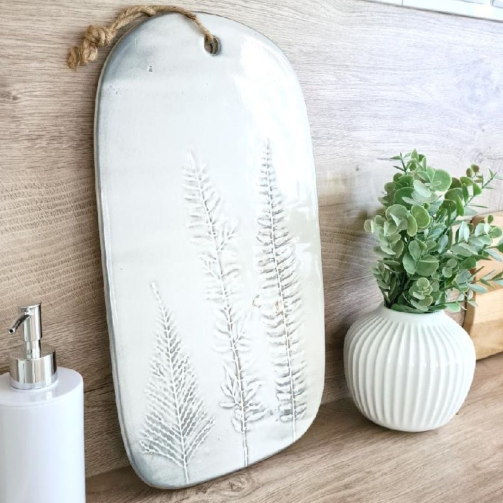 Nádherný sevírovací podnos z kameniny pro milovnice minimalismu je ten pravý.K vytvoření otisků s hliněnými formami byly použity skutečné listy kapradin. Krásné dojmy v této kameninové servírovací desce pocházejí přímo z přírody.Zavěste podnos na zeď za jutový provázek pro dekorativní akcent a pokud potřebujete podávat předkrmy nebo sýry, snadno sejměte ze zdi a použijte k servírování.