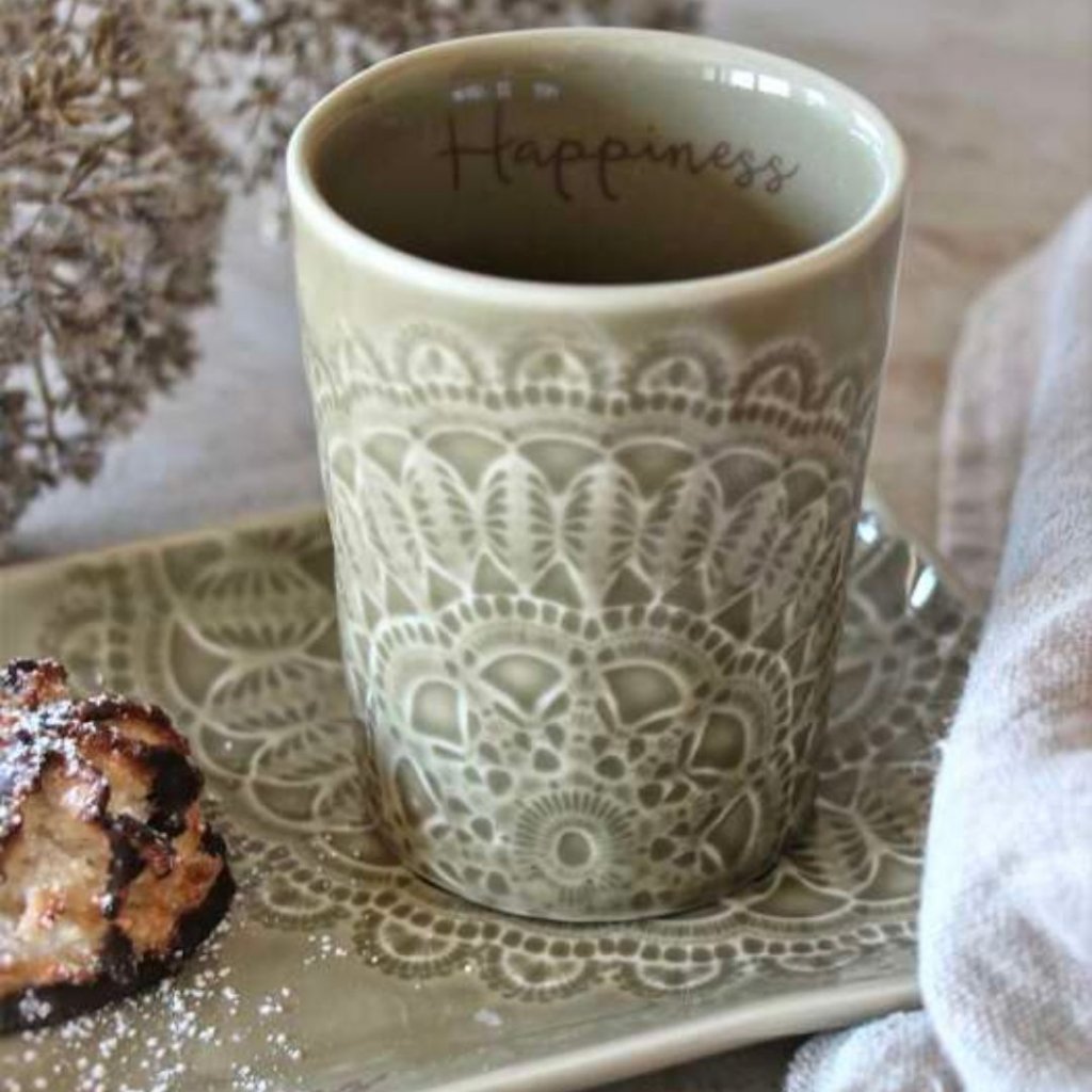 - Šálek z glazované keramiky a nápisem Happiness vám bude sloužit při vašem stolování a při každém pohledu bude dělat jen radost.