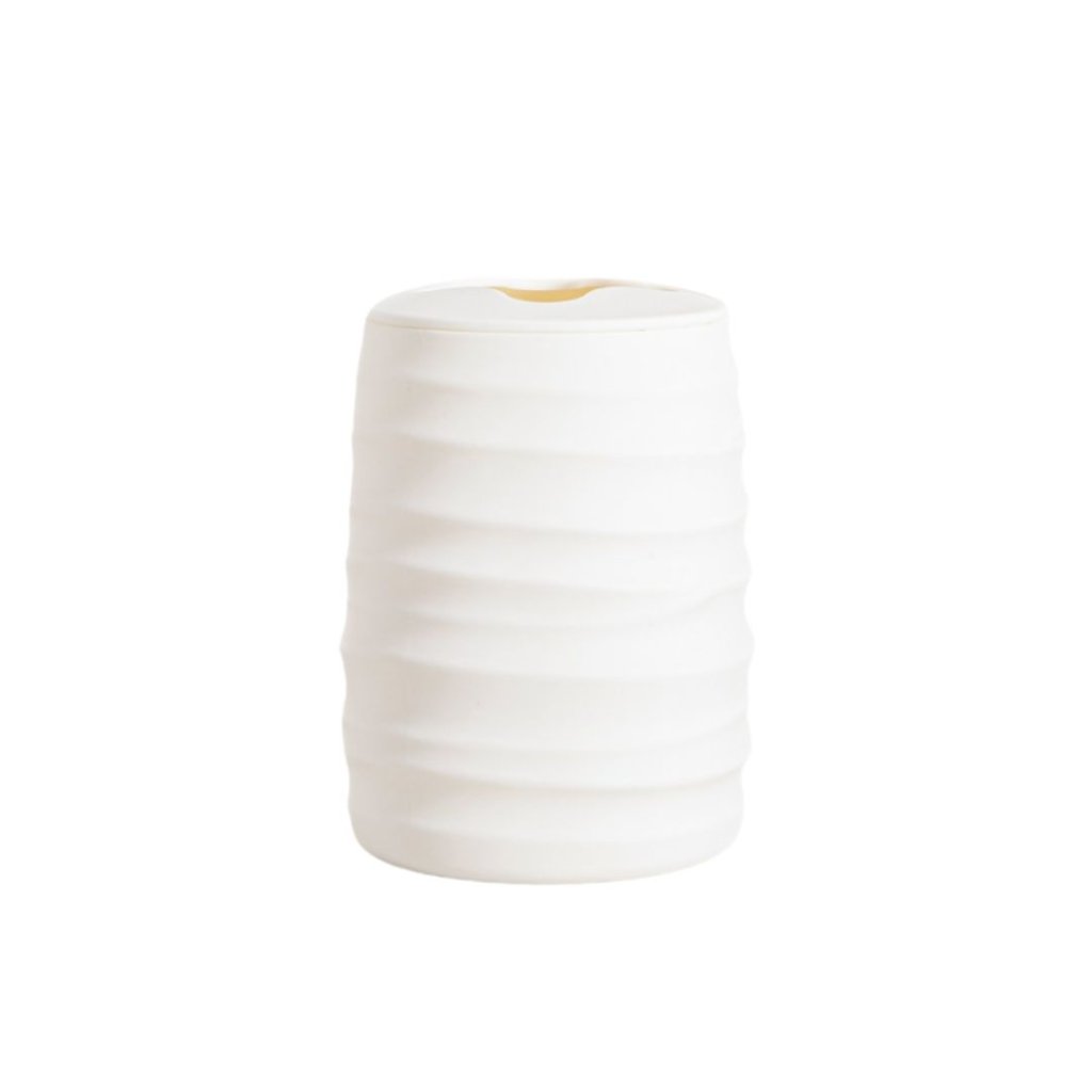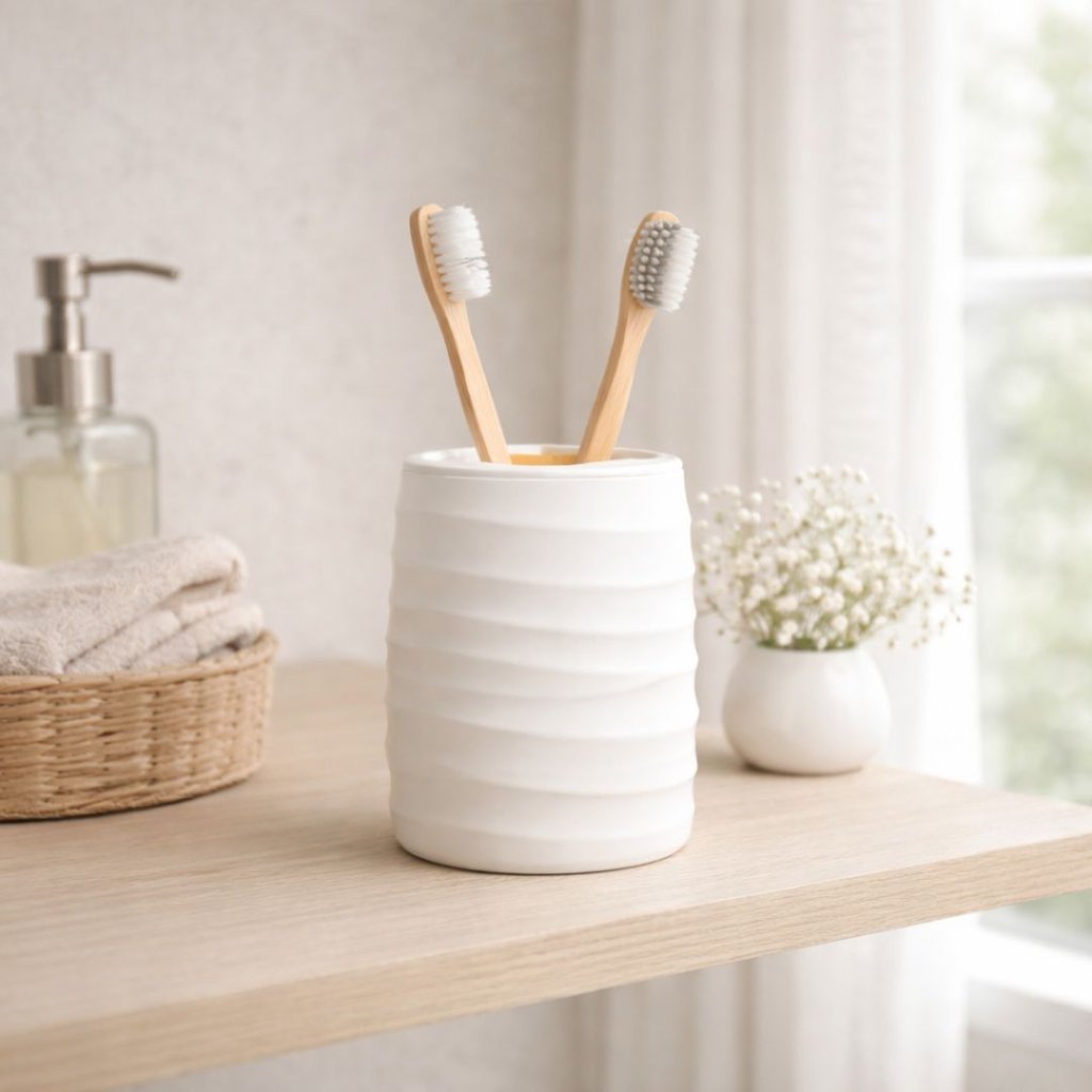 - ✨ Elegantní kelímek na kartáčky – 8,2 × 11 cm, bílá barva, pogumovaný příjemný povrch