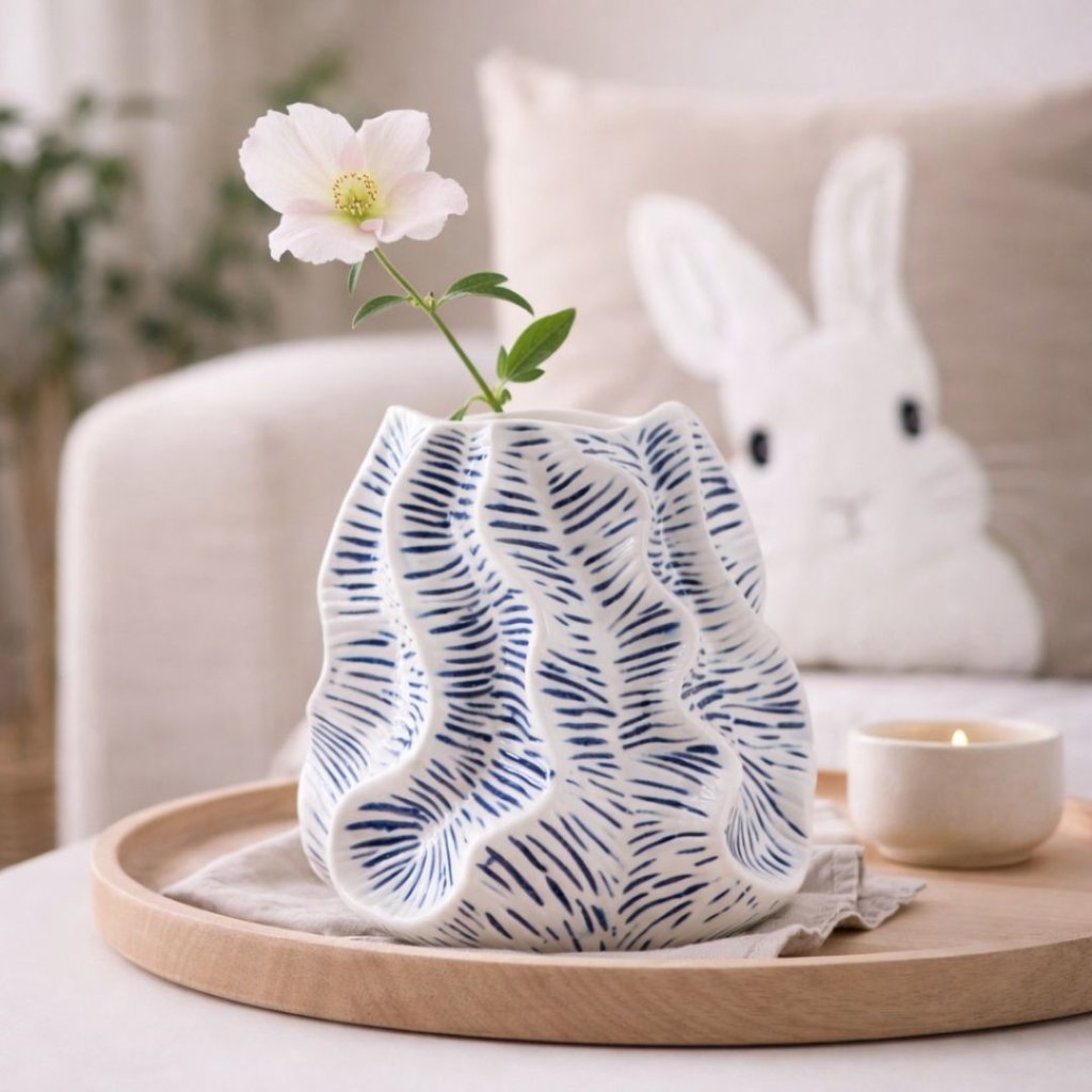 - Sošná, vlnitá forma, která zaujme na první pohled – i bez květin. Plastický povrch v kombinaci bílé a tmavě modré vytváří výrazný kontrast a dodává váze osobitý, dekorativní charakter.