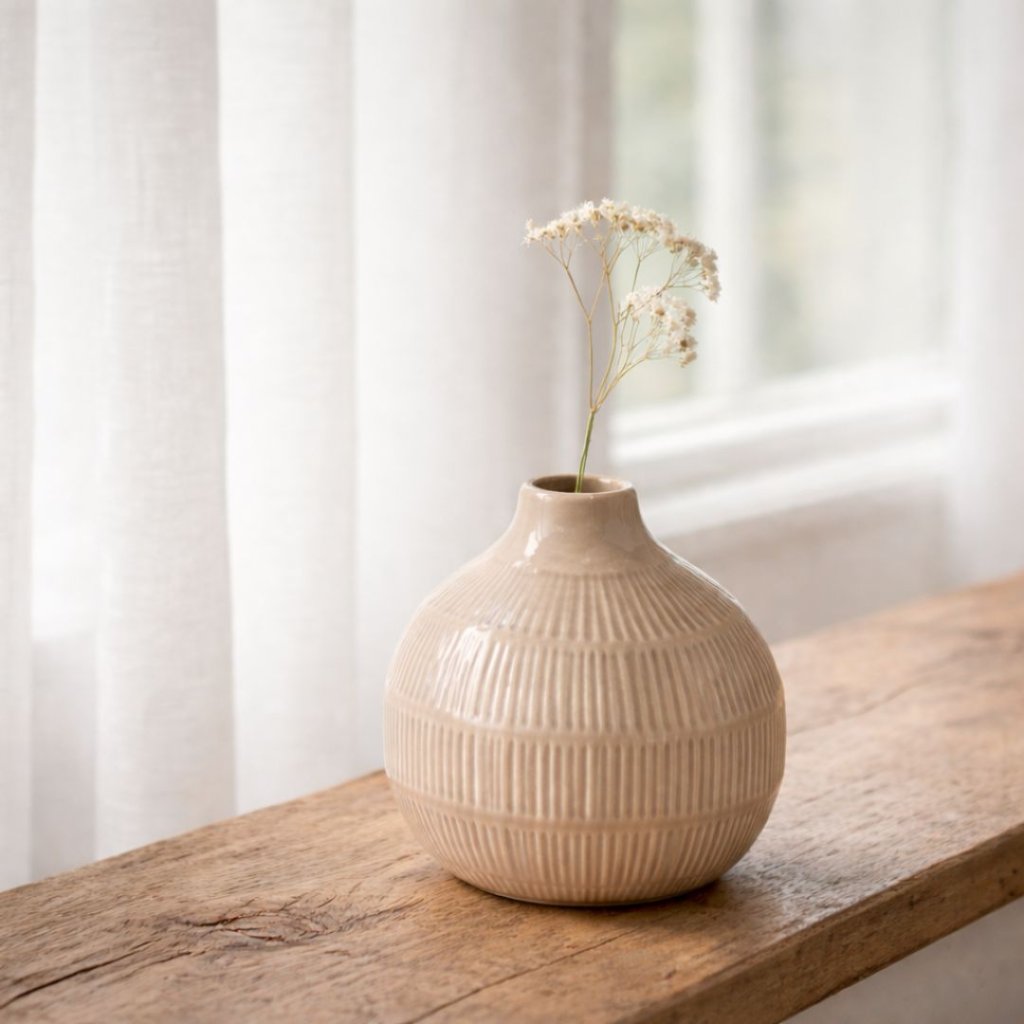 Váza Kayle je o detailech, které zpomalí prostor. Jemná struktura, měkký béžový tón a tvar, který funguje s květinou i bez ní. Stačí ji položit. A místnost se nadechne. - Malý kousek, který dělá domov klidnějším.