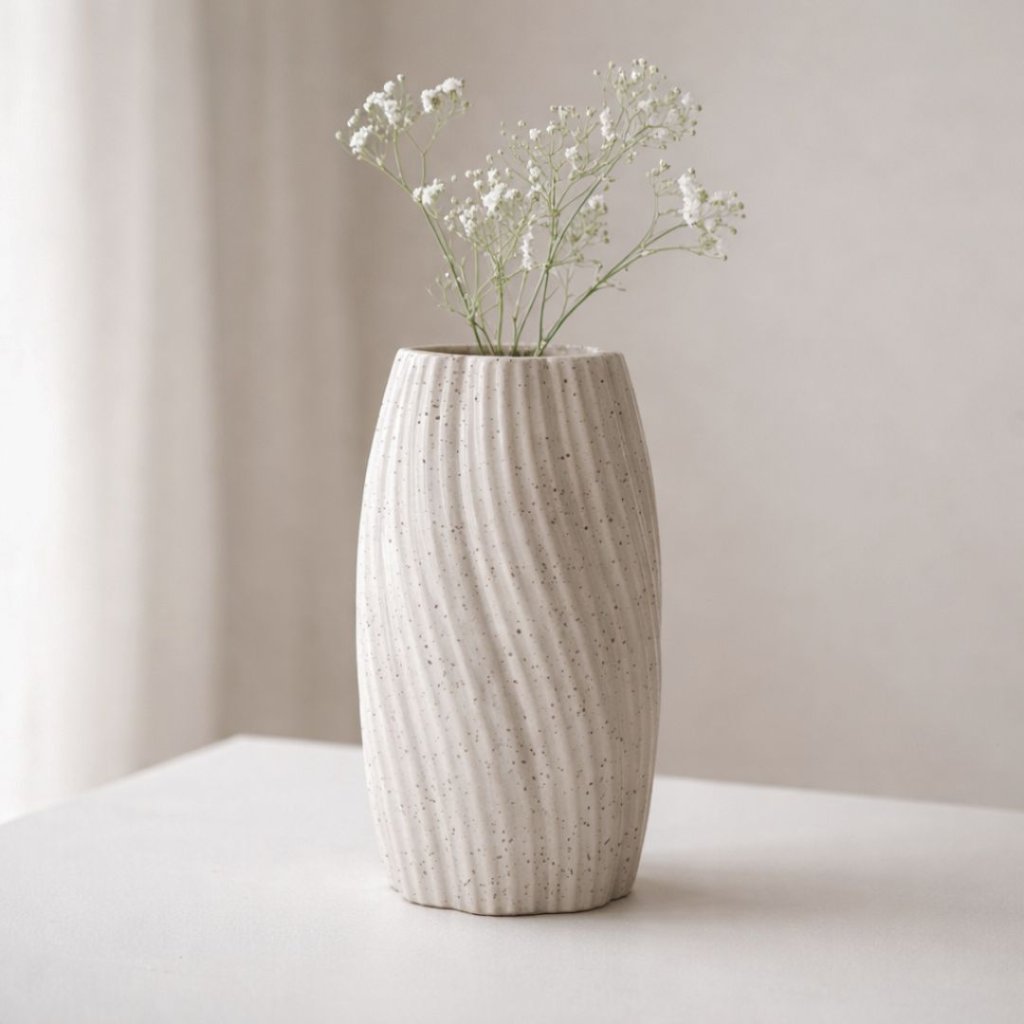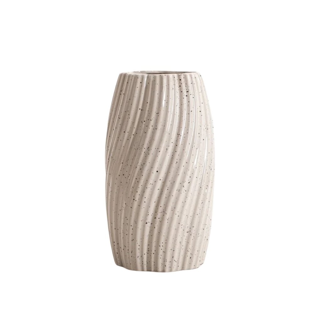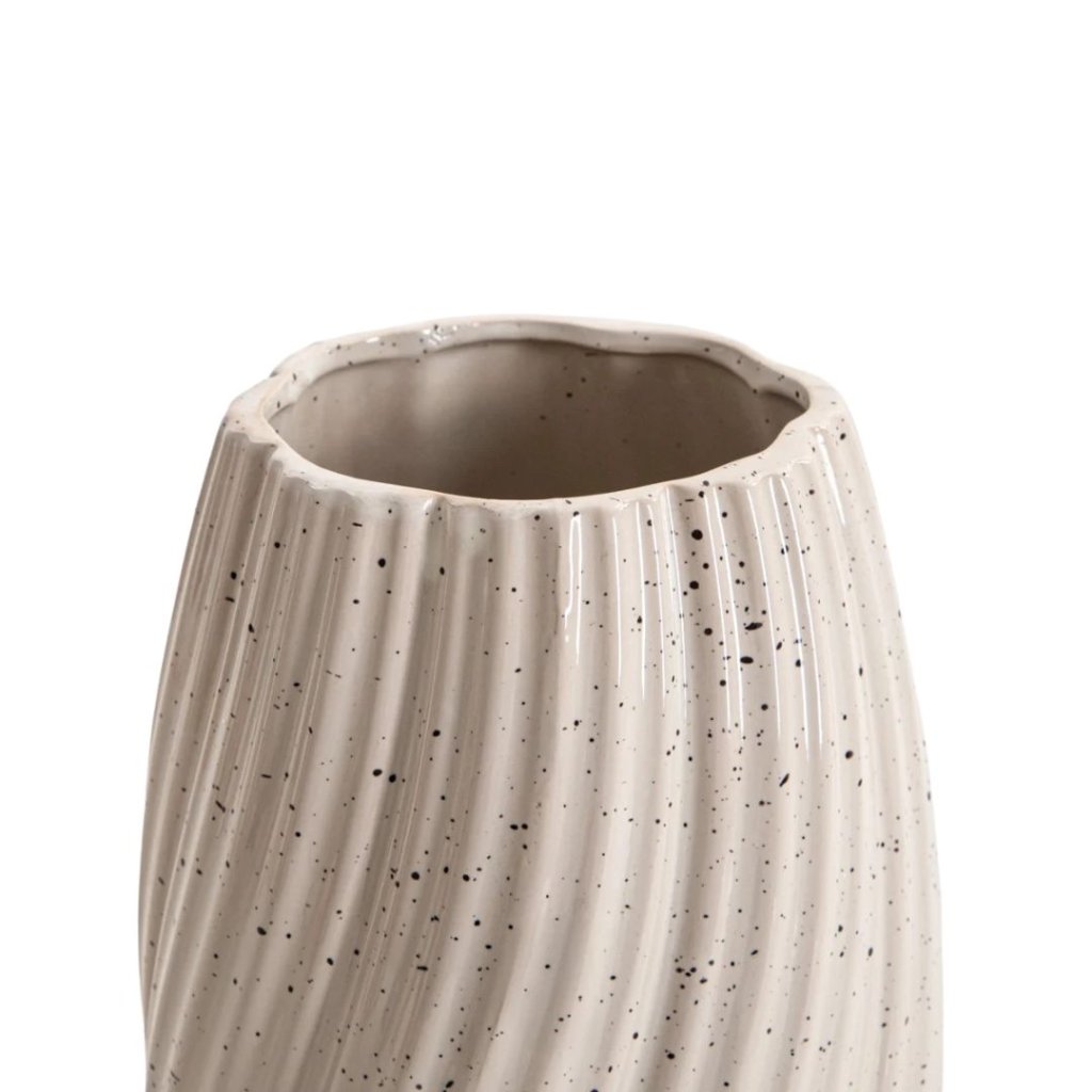 - Elegantní váza Orina zaujme jemně zvlněnou siluetou a nepravidelnými drobnými tečkami, které jí dodávají přirozený, lehce rustikální charakter. Tlumený odstín a organická struktura krásně vyniknou ve světlém, minimalistickém interiéru.