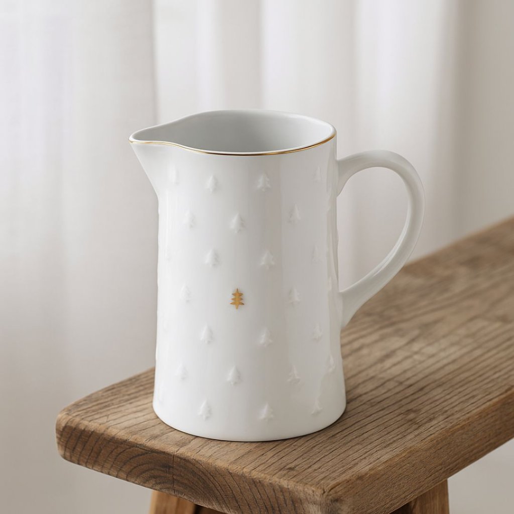 - Elegantní porcelánový džbánek s jemným reliéfem vánočních stromků a decentní zlatou ozdobou zaujme na první pohled.