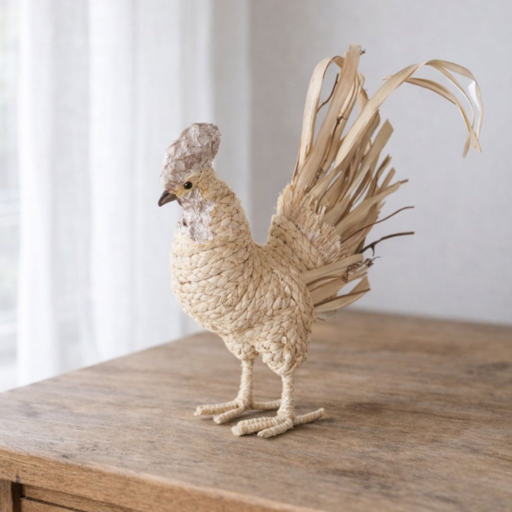 Ručně tvarovaný kohout z kukuřičného šustí působí lehce, venkovsky a opravdově.