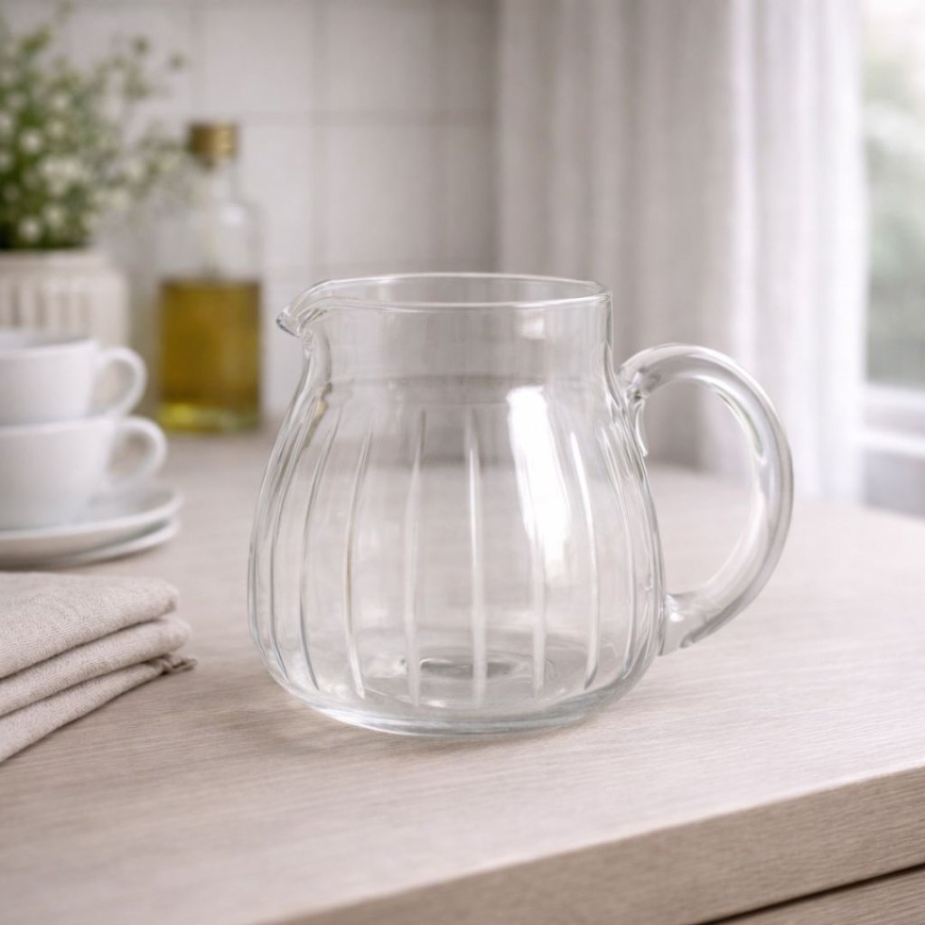 Malý skleněný džbánek s jemnými leptanými pruhy a uchem.