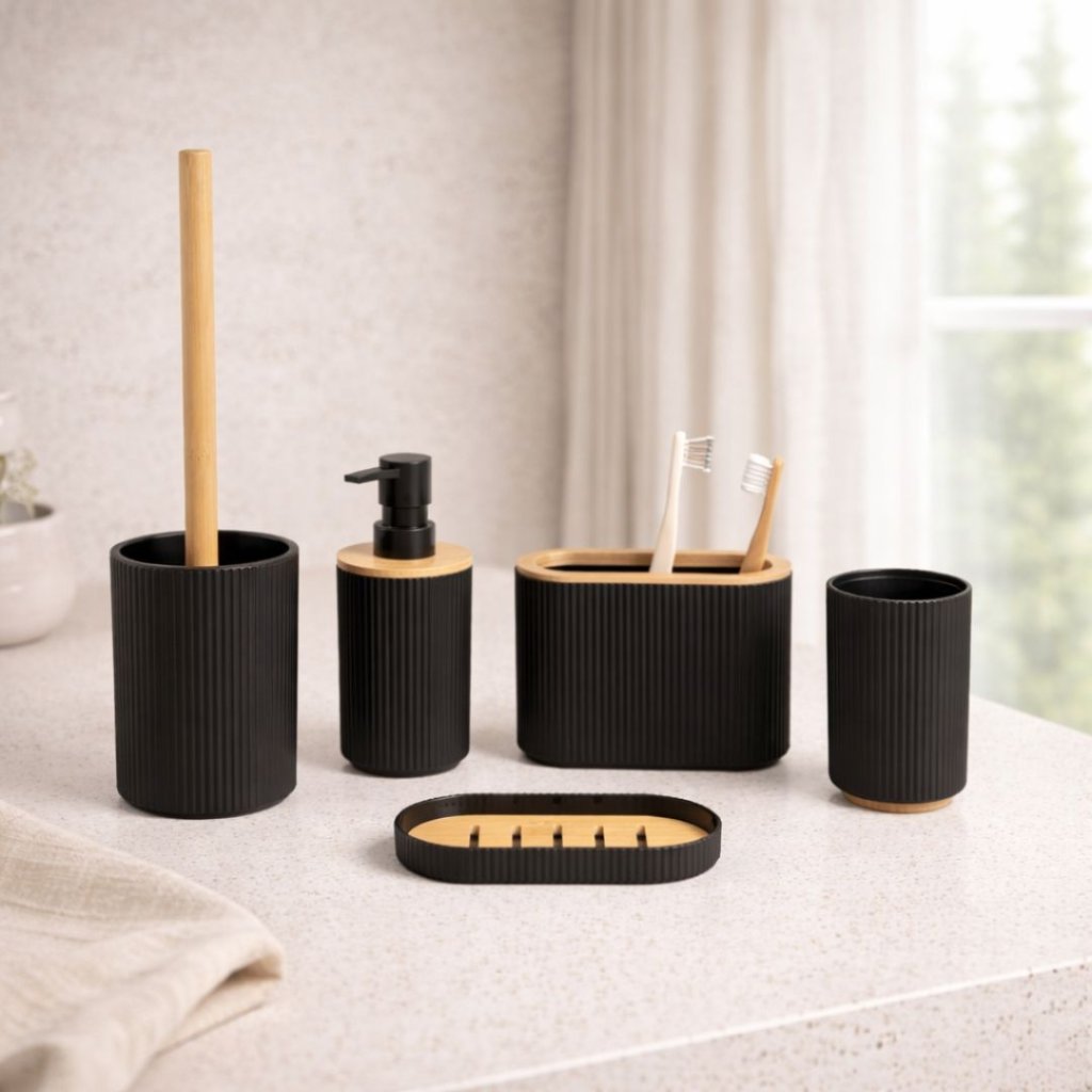 Sada 5 ks: dávkovač tekutého mýdla, kelímek, držák na zubní kartáčky, mýdlenka, WC štětka