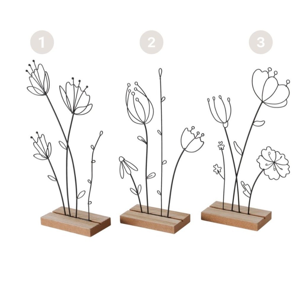 - Kovový květ s jemnými detaily zdobí dřevěný podstavec, vytvářející harmonickou kombinaci přírodního materiálu a moderního designu.