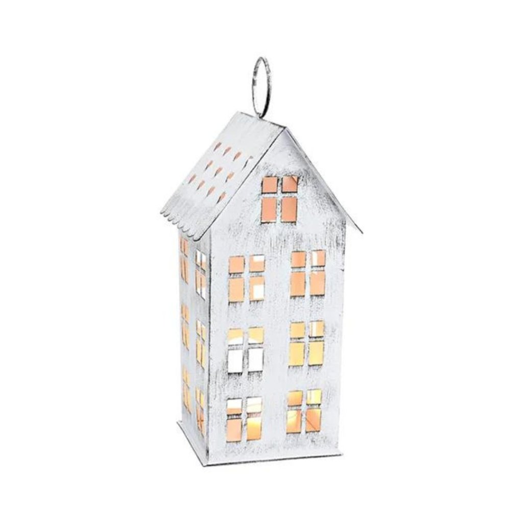 - Kovový lucerna domek v bílé barvě s patinou na led nebo válcovou svíčku.