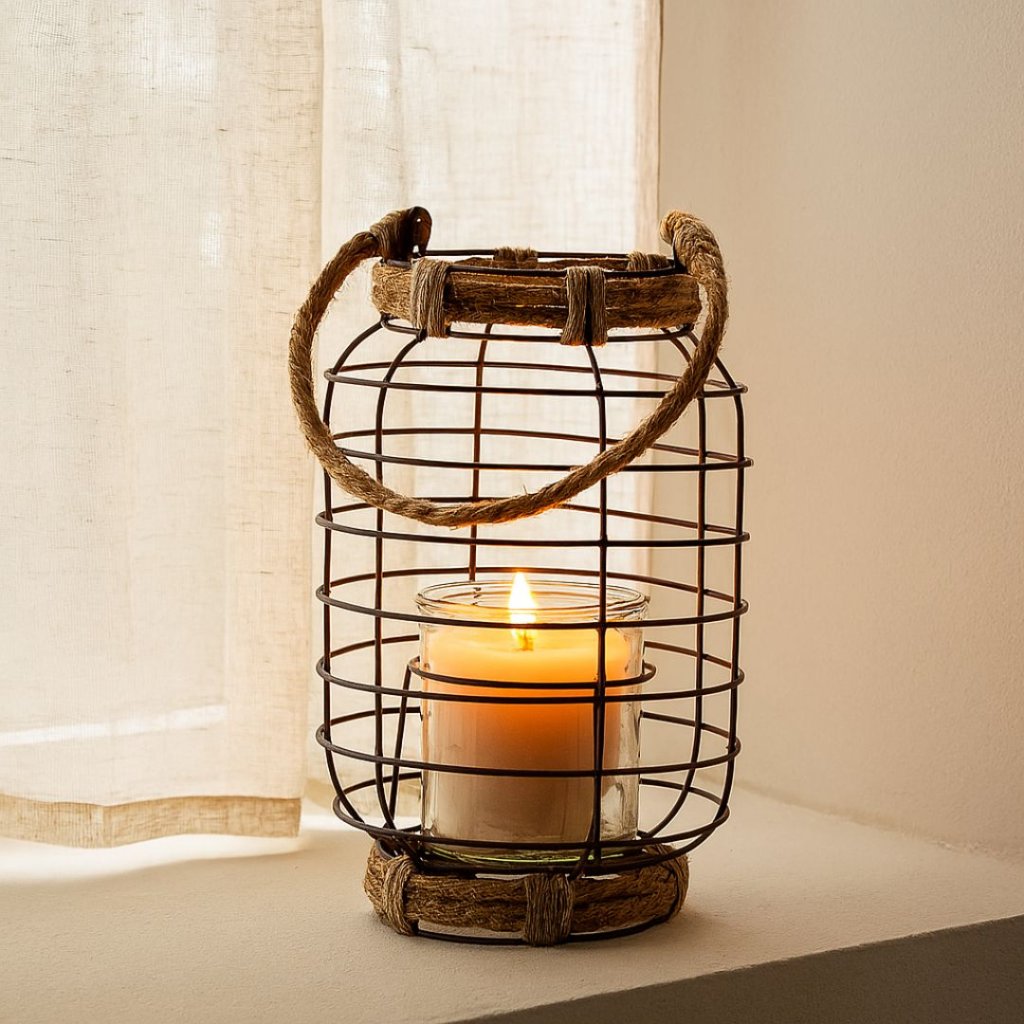 - Hnědá kovová lucerna v kombinaci skla na svíčku a přírodním lanem působí velmi stylově. Vzdušný a jednoduchý design lucerny vynikne u vás doma i na terase při posezení s přáteli při kávě nebo čaje si zapálíte lucernu a budete se kochat jejím mihotavým světlem.