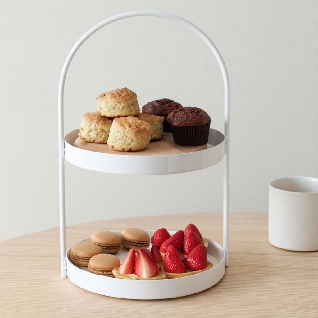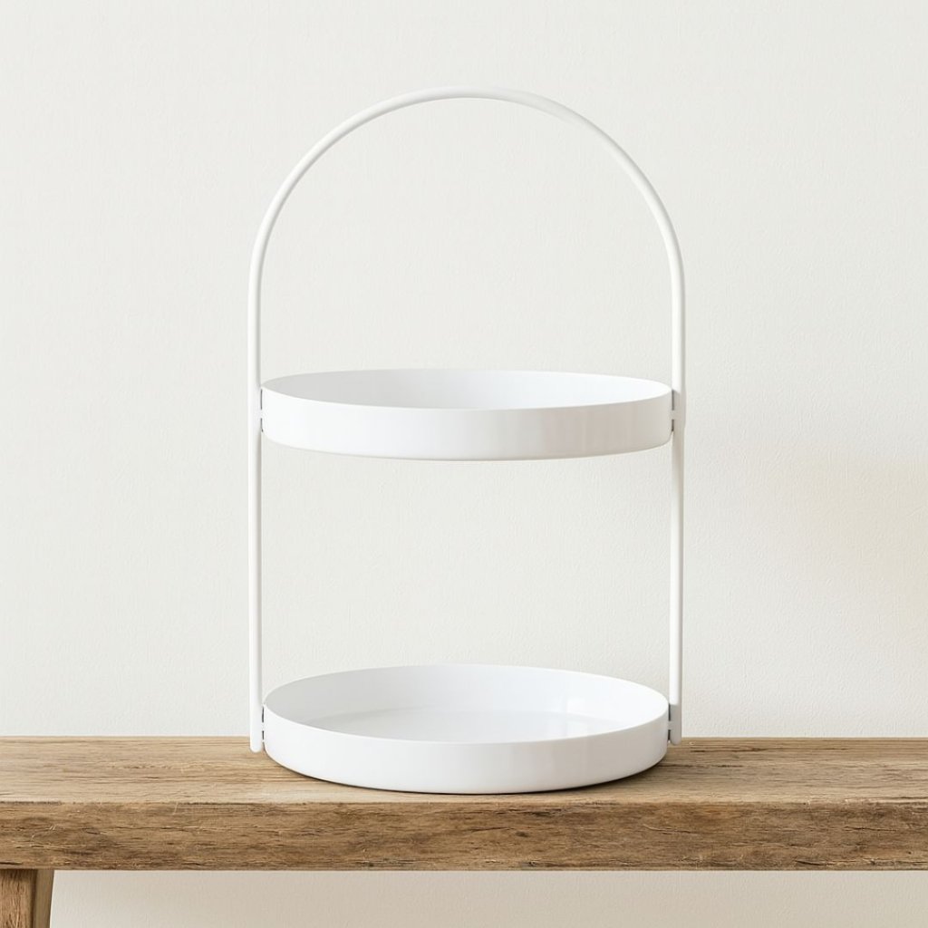 - Minimalistický kovový etažér v bílé barvě bude nejen dokonalou ozdobou prostřeného stolu, ale najde využití třeba i na kuchyňské lince, kde na něj můžete odkládat vaše nejoblíbenější hrnky a budete je tak vždy mít po ruce.