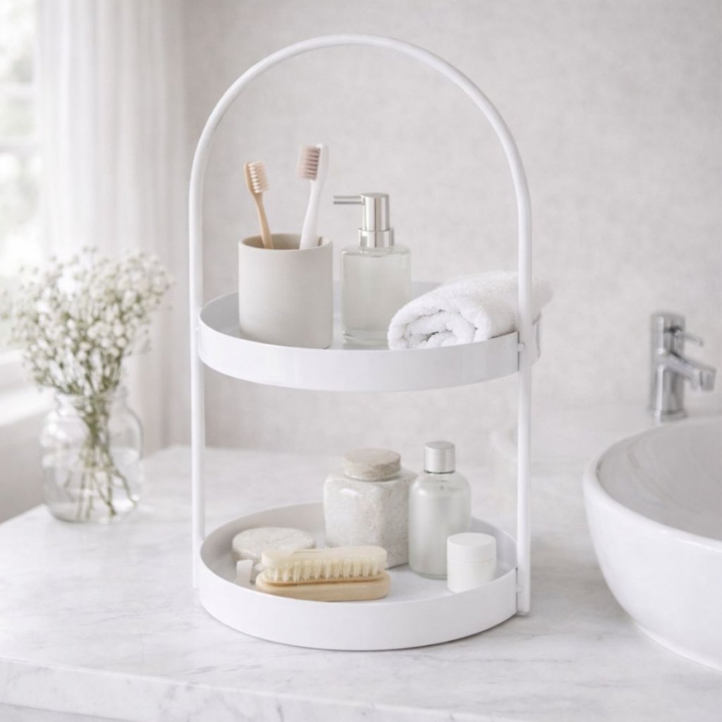 Dvě patra dávají prostor drobným radostem – svíčkám, jarní dekoraci, ovoci nebo koupelnovým maličkostem, které chcete mít po ruce a zároveň na očích. -