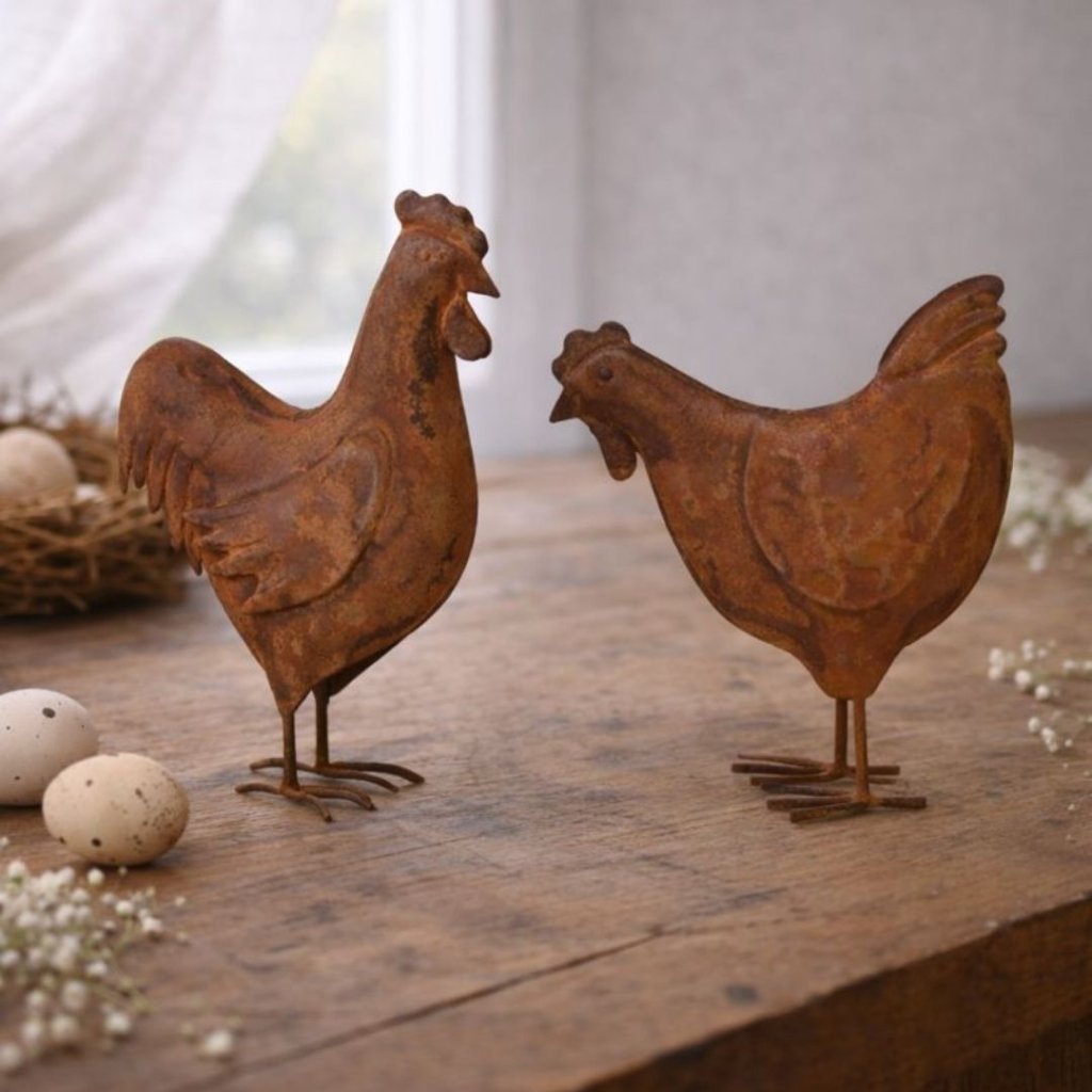 - Jemná velikonoční dekorace, která vnese do domova klid a hřejivou atmosféru venkova. Kovový kohout a slepice Hona působí přirozeně a nadčasově – krásně vyniknou na rustikálním stole, parapetu i mezi jarními dekoracemi.