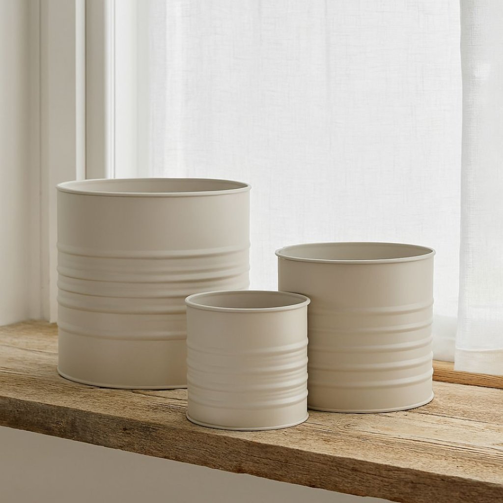 - Sada kovových květináčů v matné béžové barvě je stylovým a univerzálním doplňkem do moderních i klasických interiérů.