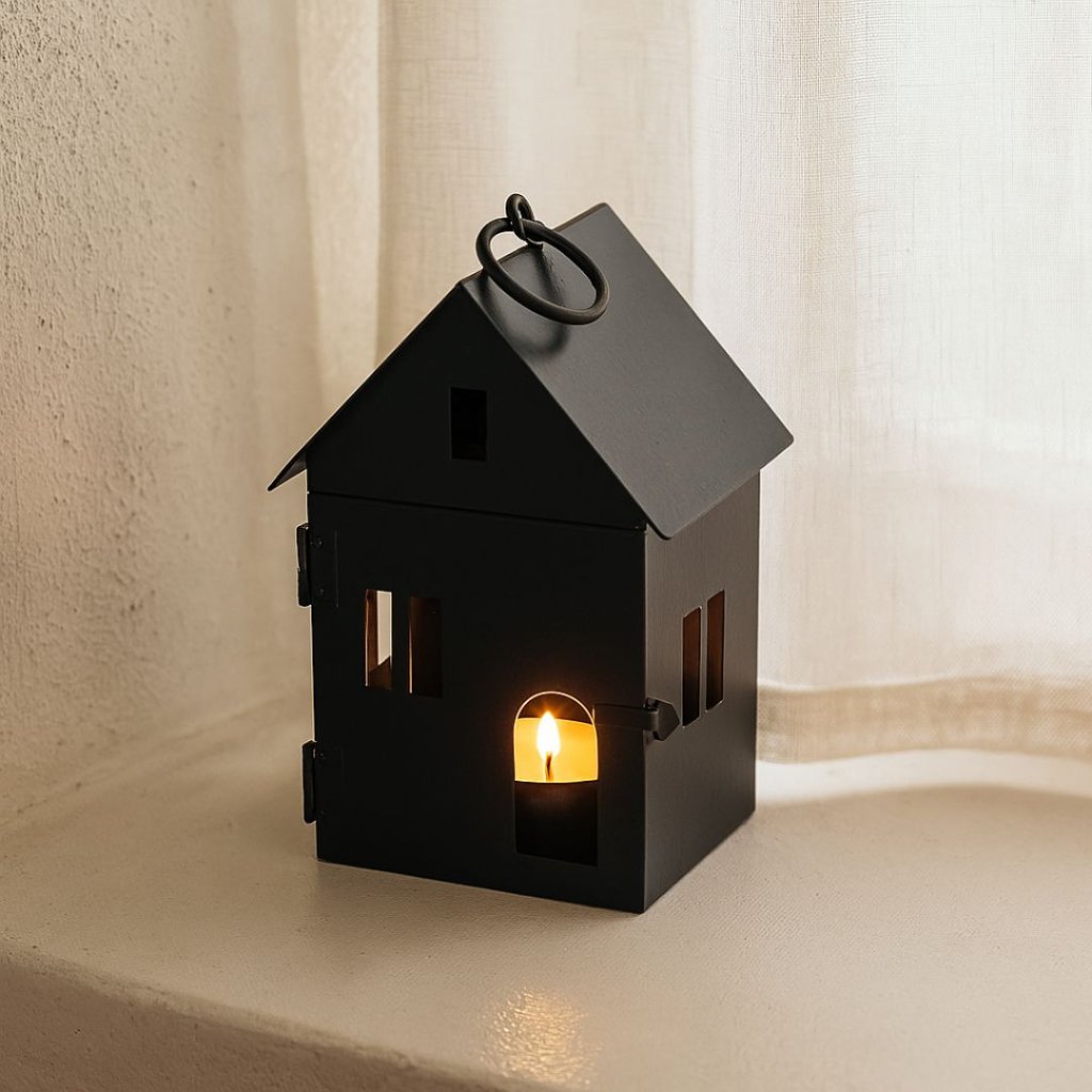 - Kovový svícen domek Alesun v černé barvě na led nebo čajovou svíčku.