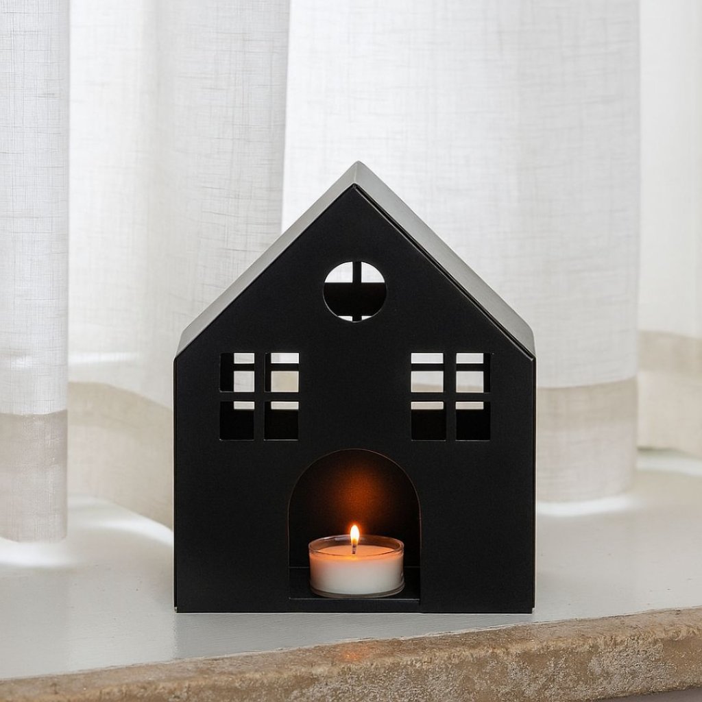 - Kovový svícen domek v černé barvě na led nebo válcovou svíčku. Srdce a okénka na domku krásně zvýrazní zapálená svíčka,kterou lze u nás zakoupit. S výklopným víkem na boční straně. Lucerna upoutá pozornost kamkoli ji postavíte.